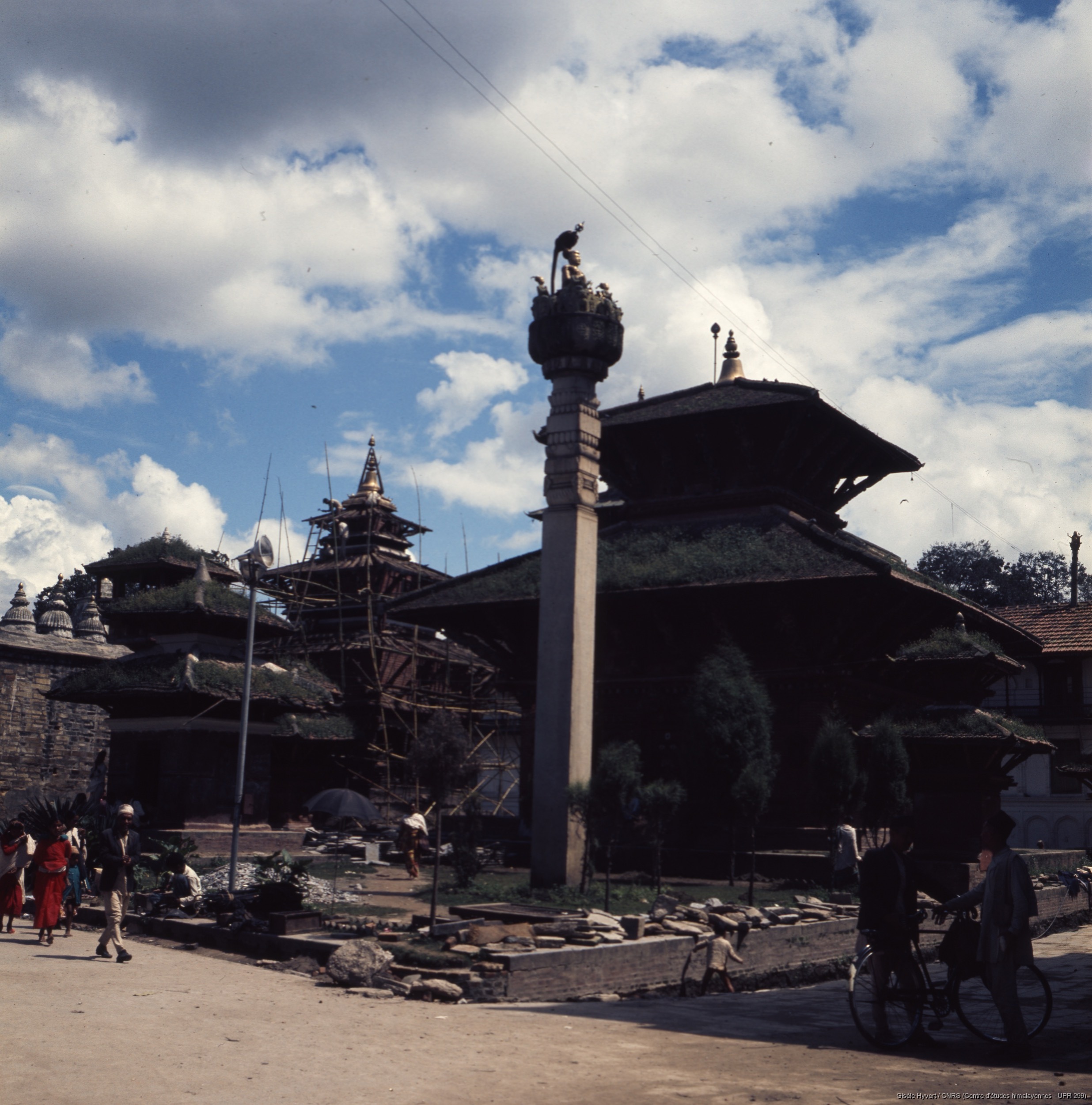 Vallée de Kathmandu c.1972-1975 / Temple de Jagannath et statue en cuivre doré et repoussé du roi Pratap Malla au sommet d'une colonne. Au fond temple de Narayan en restauration.  / Hyvert, Gisèle  / Kathmandu, Durbar square (Kathmandu district), Népal