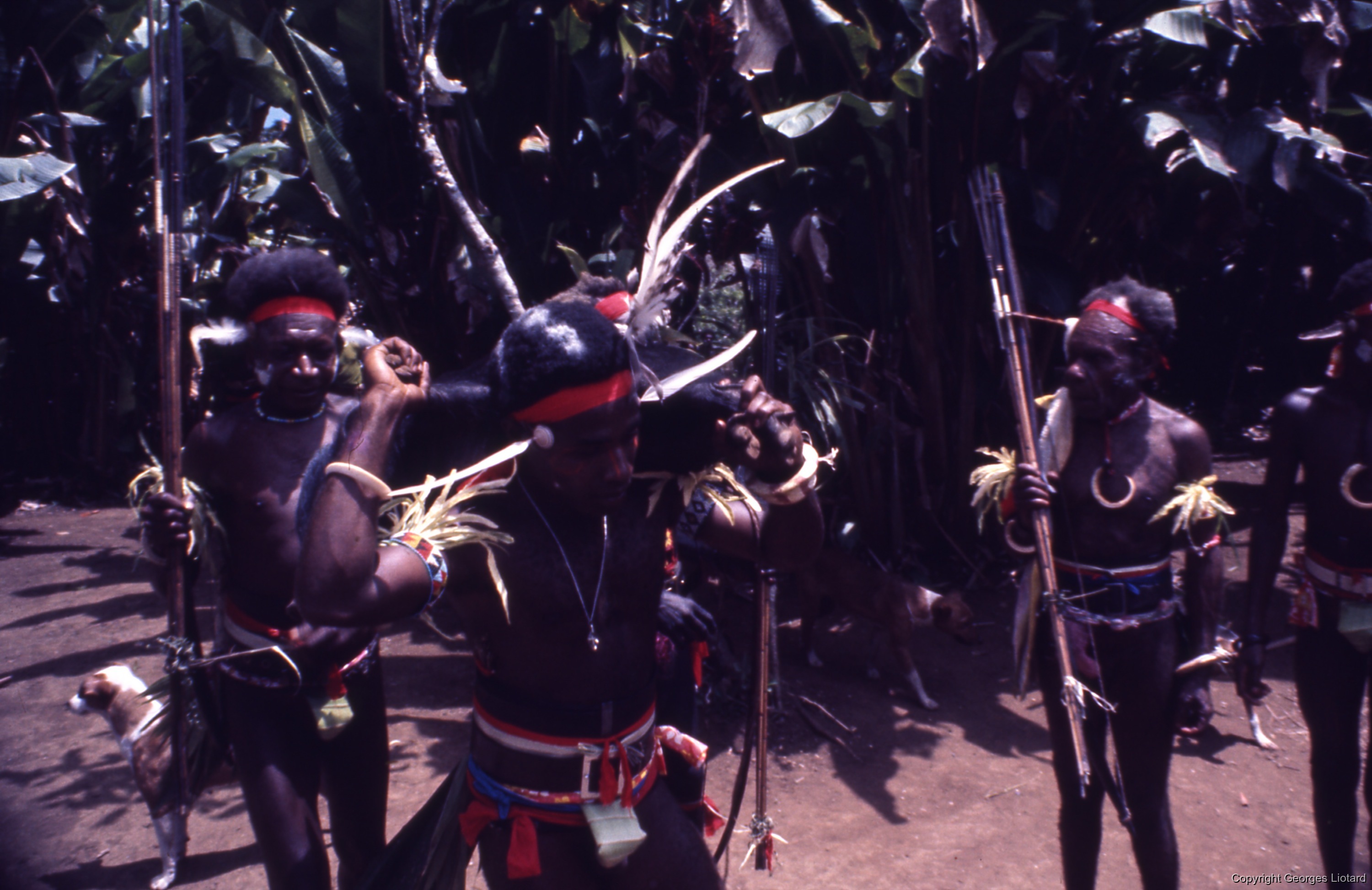 File d'hommes débouchant d'un sentier en dansant, arc et flèches en main. Danseurs peints enduits d'huile de coco et parés de tissus rouge vif (brassards et tête).