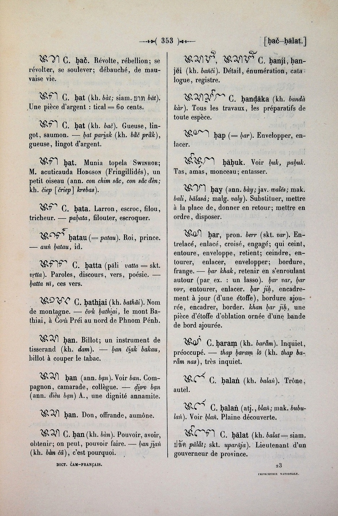 Cabaton, Antoine; Aymonier, Etienne 1906 [accessed: 2026/1/20]. "Dictionnaire Cam-Français, E. Aymonier et A. Cabaton" (Object Id: 11058). In