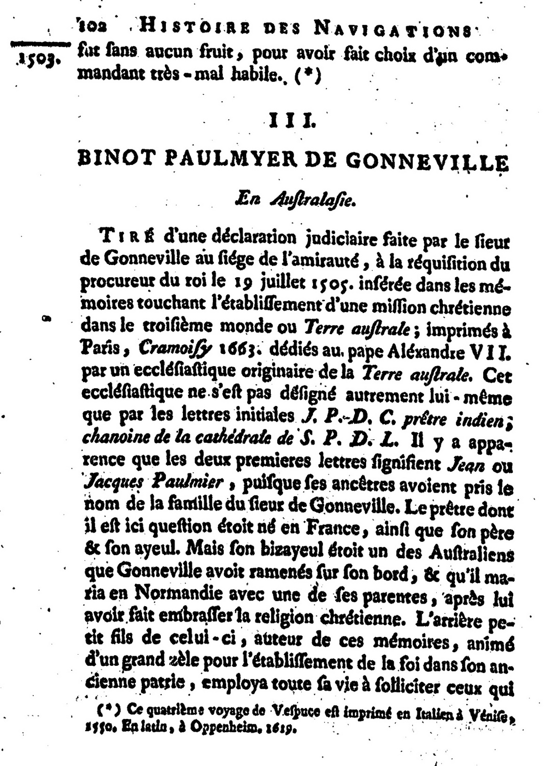 Quote this document De Brosses, Charles 1756 [accessed: 2026/2/3]. "Binot Paulmyer de Gonneville. En Australasie" (Object Id: 1353). In Histoire des Navigations aux Terres Australes tome 1, Brosses, Charles de, 1709-1777 . ODSAS: https://www.odsas.net/object/1353.