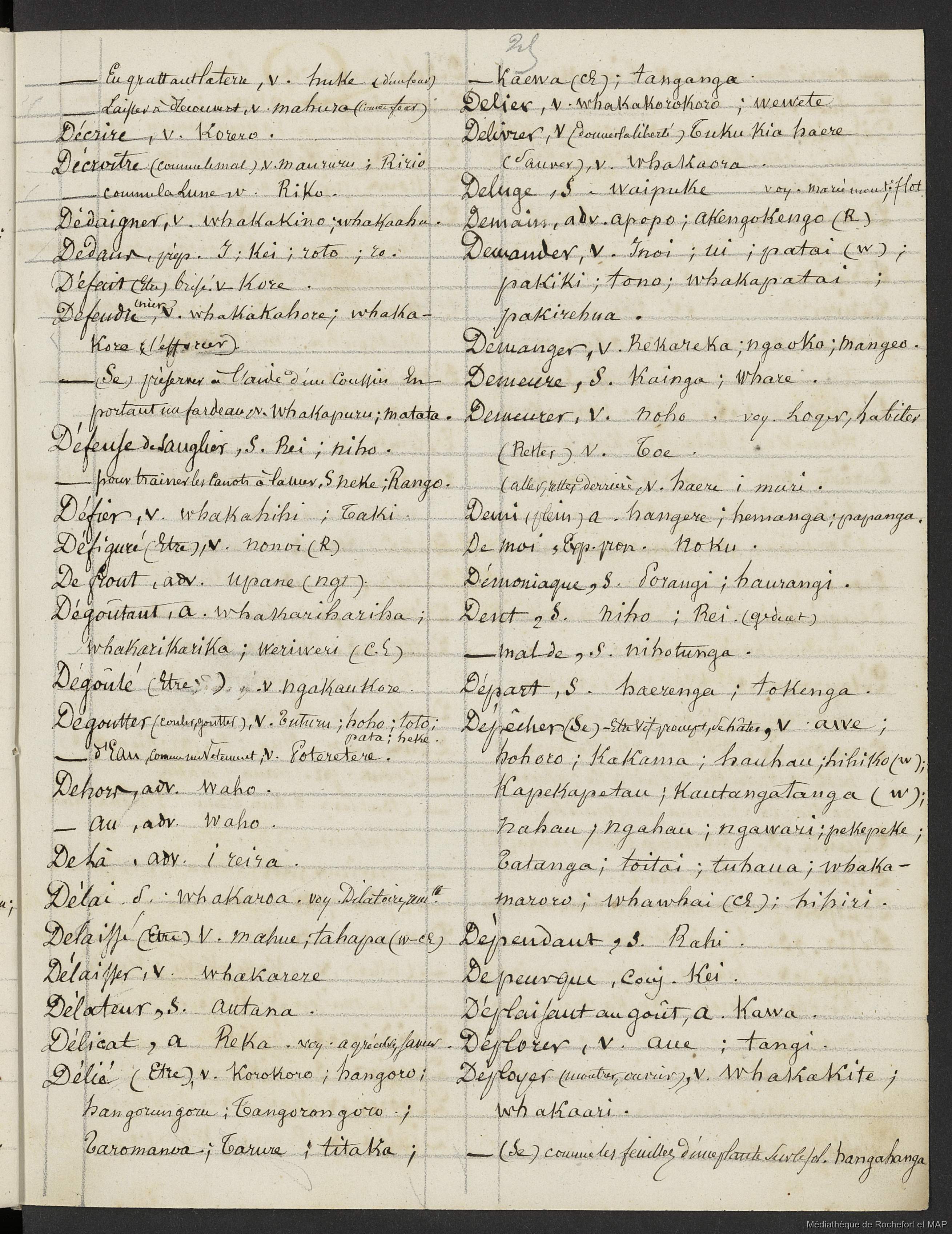 Quote this document Lesson, Pierre-Adolphe [accessed: 2026/4/28]. "Dictionnaire Français-nouveau Zélandais (B172996201_Ms00076)" (Object Id: 159180). In Dictionnaire Français-nouveau Zélandais (B172996201_Ms00076). ODSAS: https://www.odsas.net/object/159180.