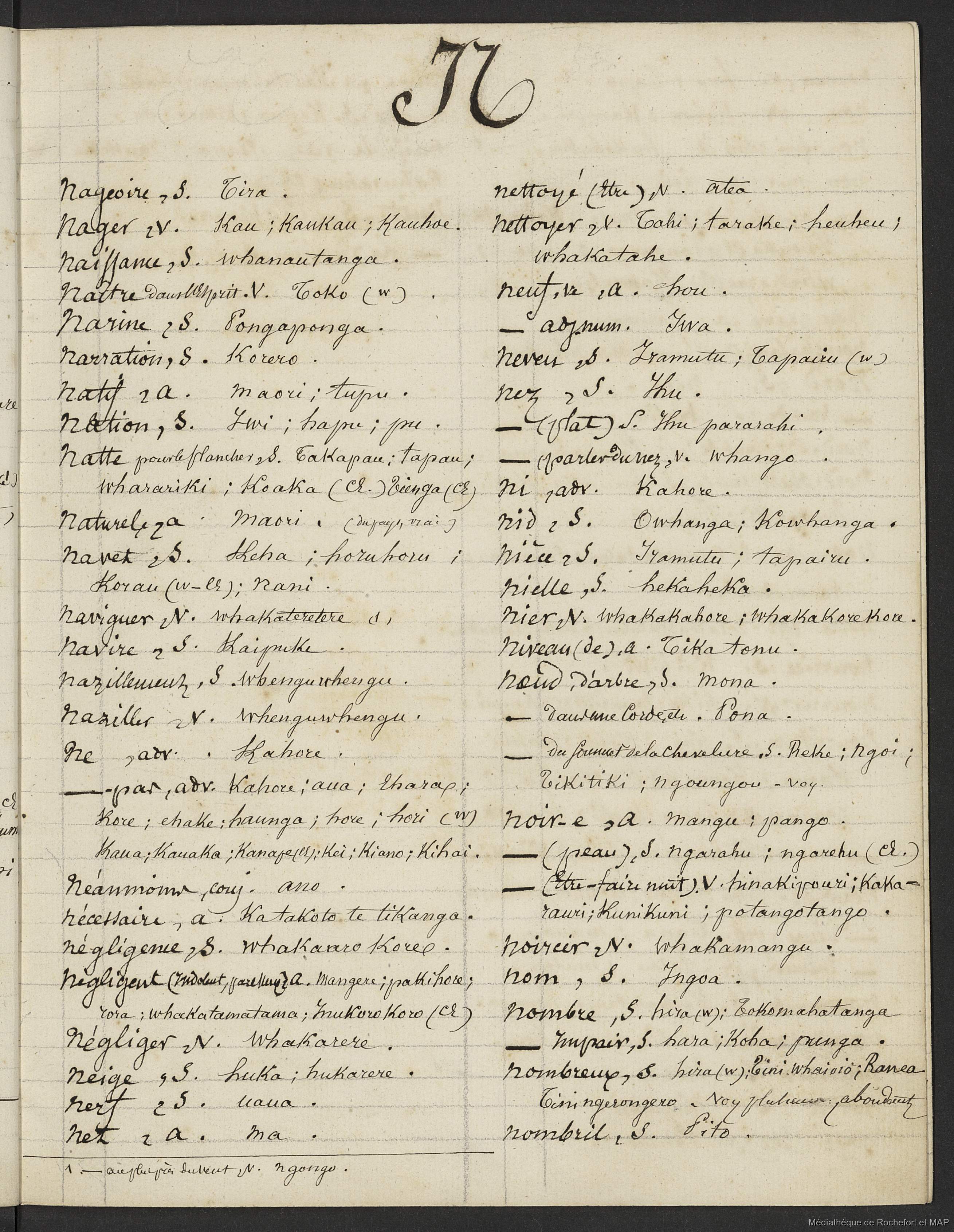 Lesson, Pierre-Adolphe [accessed: 2026/1/27]. "Dictionnaire Français-nouveau Zélandais (B172996201_Ms00076)" (Object Id: 159208). In