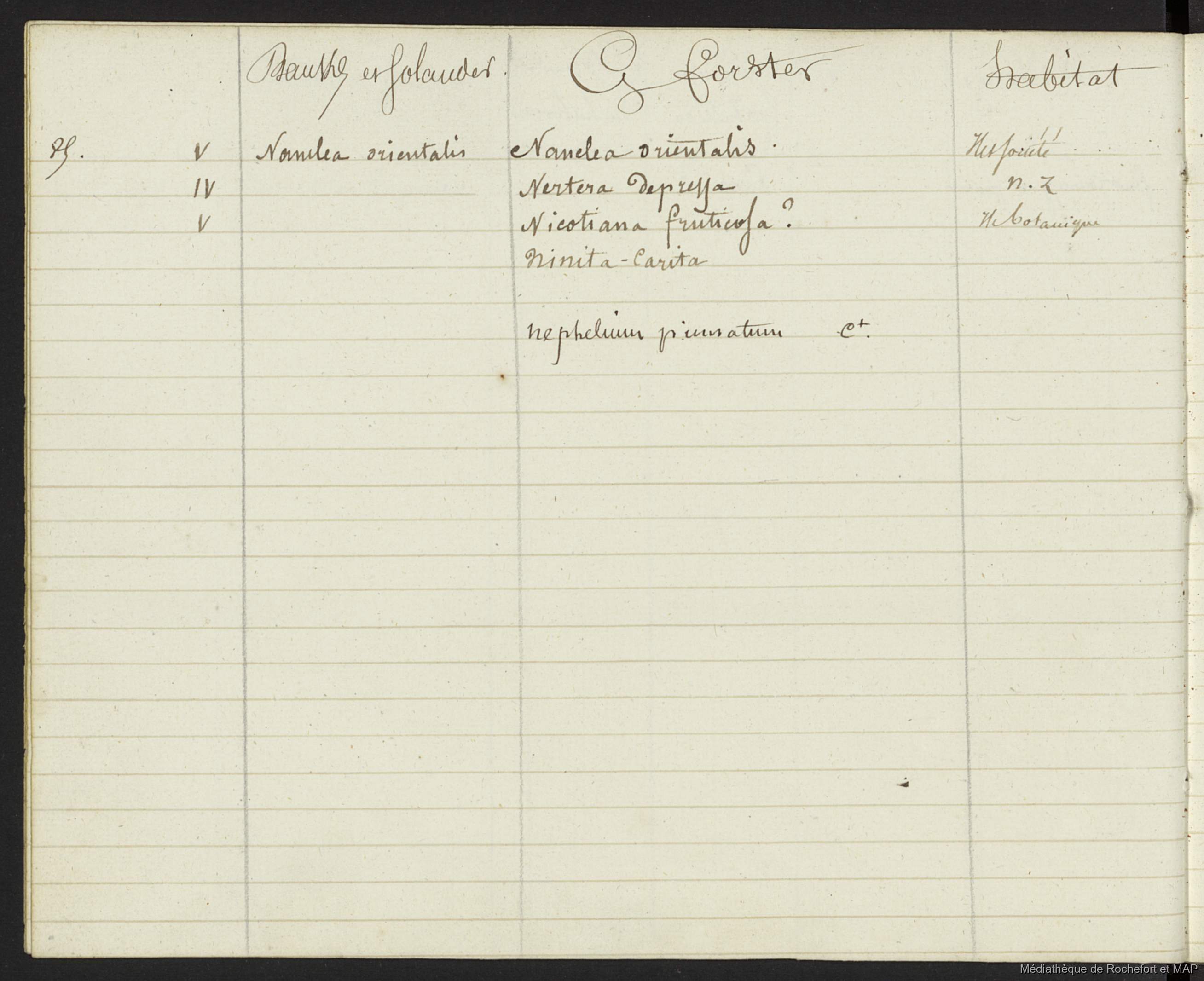 Quote this document Lesson, Pierre-Adolphe [accessed: 2026/1/25]. "Plantes indiquées par Parkinson et récoltées par Banks et Solander (B172996201_Ms00114)" (Object Id: 159498). In Plantes indiquées par Parkinson et récoltées par Banks et Solander (B172996201_Ms00114). ODSAS: https://www.odsas.net/object/159498.