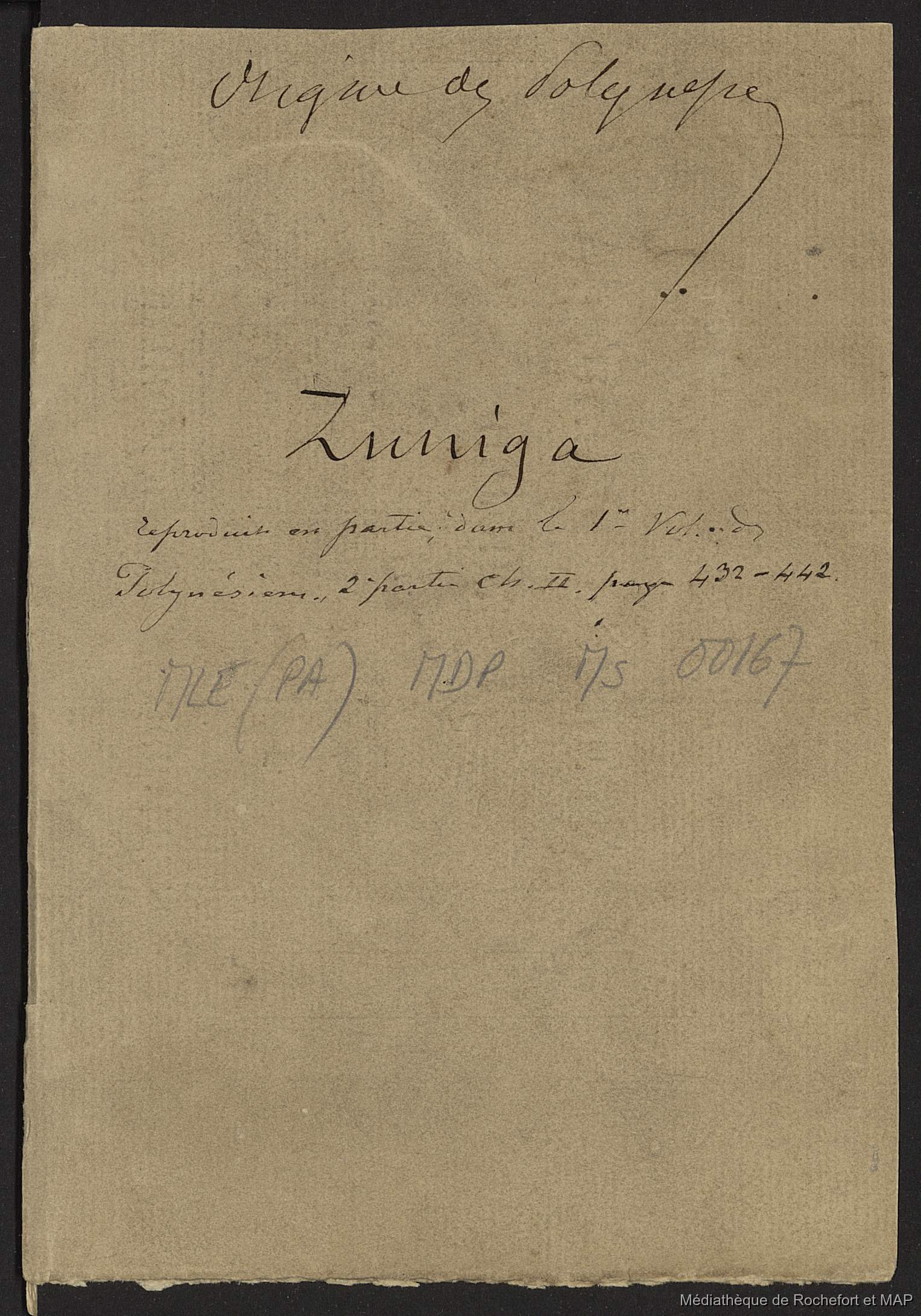 Lesson, Pierre-Adolphe [accessed: 2026/1/26]. "Origine des polynésiens : sur les habitants trouvés aux Philippines par les Espagnols (B172996201_Ms00167)" (Object Id: 164425). In