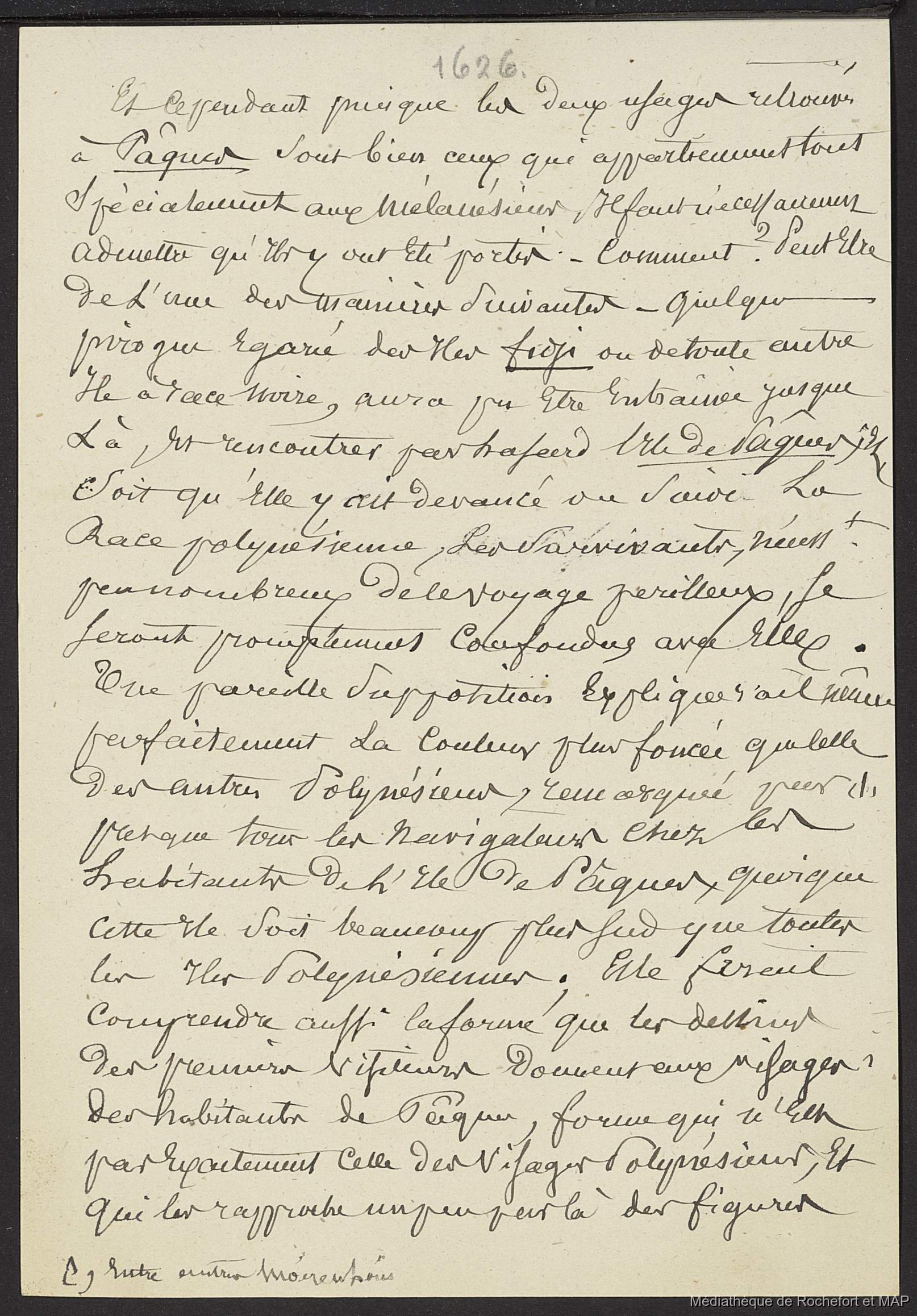 Quote this document Lesson, Pierre-Adolphe [accessed: 2026/1/31]. "Théorie de migrations. Iles Marquises, Paumoutu, Mangareva, Pâques. (B172996201_Ms00179)" (Object Id: 165471). In Théorie de migrations. Iles Marquises, Paumoutu, Mangareva, Pâques. (B172996201_Ms00179). ODSAS: https://www.odsas.net/object/165471.