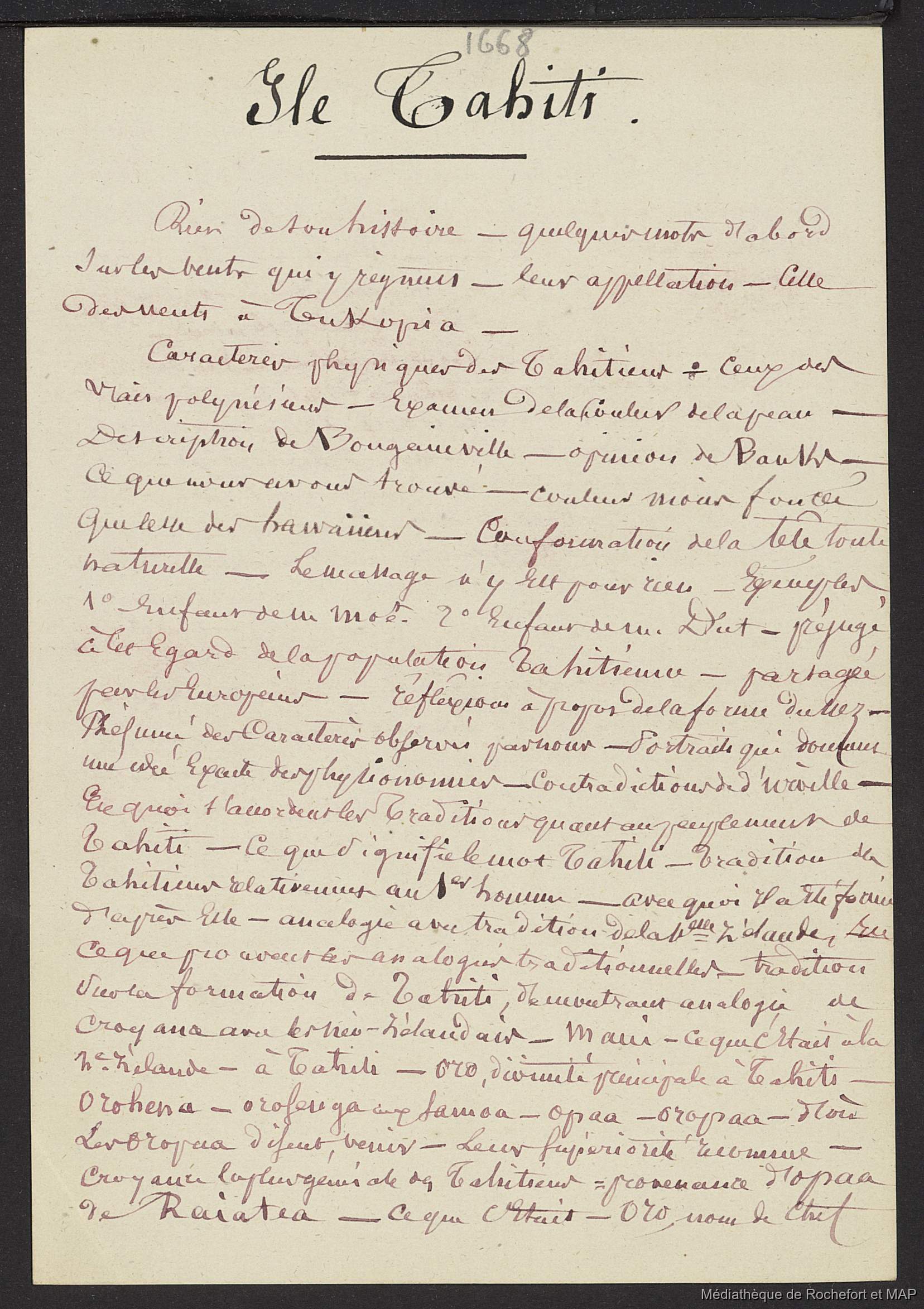 Lesson, Pierre-Adolphe [accessed: 2026/2/11]. "Théorie des migrations. Sur Tahiti et Manaia (B172996201_Ms00180)" (Object Id: 165509). In
