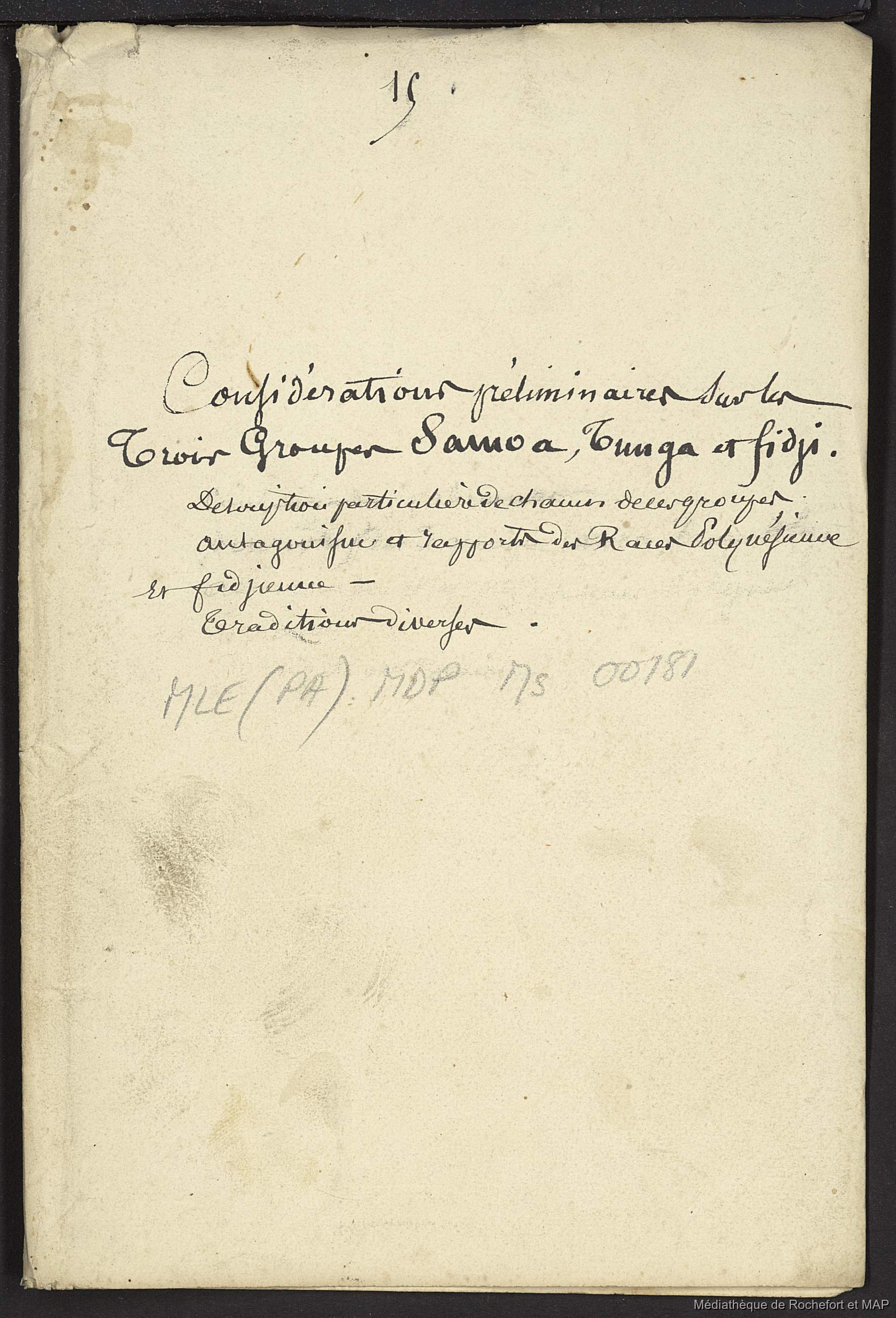 Théorie des migrations. Considération préliminaire sur les trois groupes, Samoa, Tunga et Fidji (B172996201_Ms00181) [
