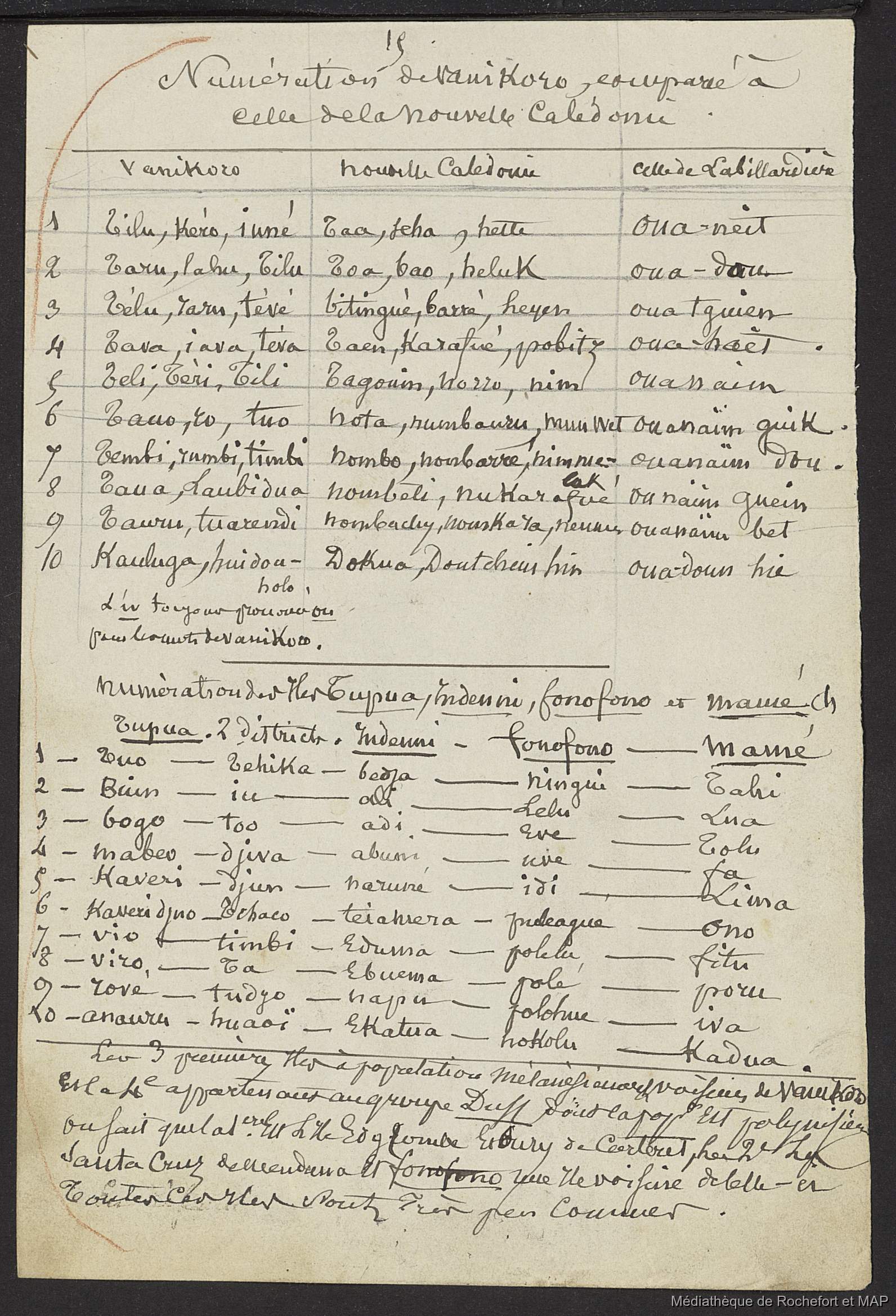 Lesson, Pierre-Adolphe [accessed: 2026/2/10]. "Théorie des migrations. Question Carolines et Mariannes ; Numération de la Nouvelle-Calédonie (B172996201_Ms00182)" (Object Id: 165609). In