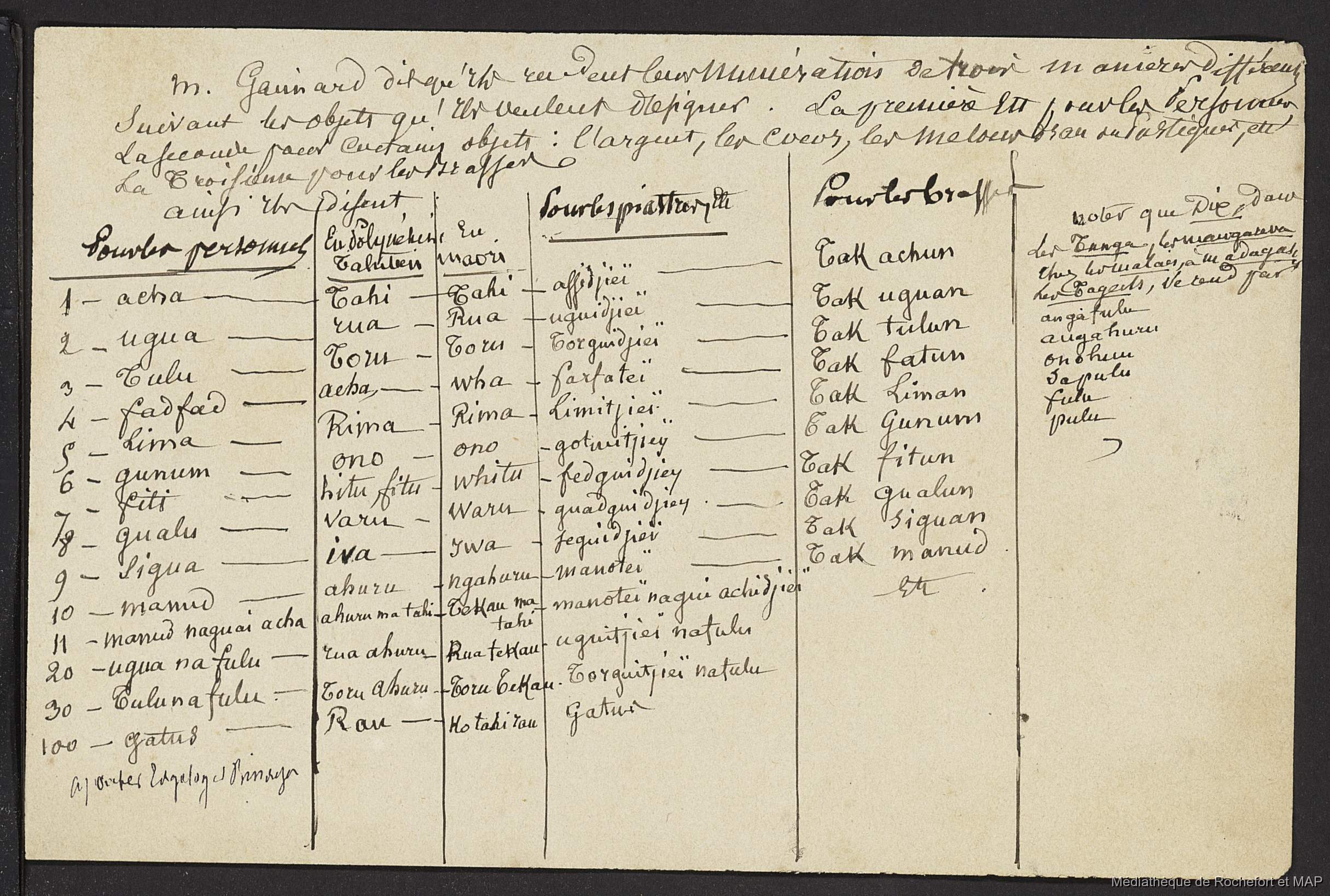 Lesson, Pierre-Adolphe [accessed: 2026/2/10]. "Théorie des migrations. Question Carolines et Mariannes ; Numération de la Nouvelle-Calédonie (B172996201_Ms00182)" (Object Id: 165657). In