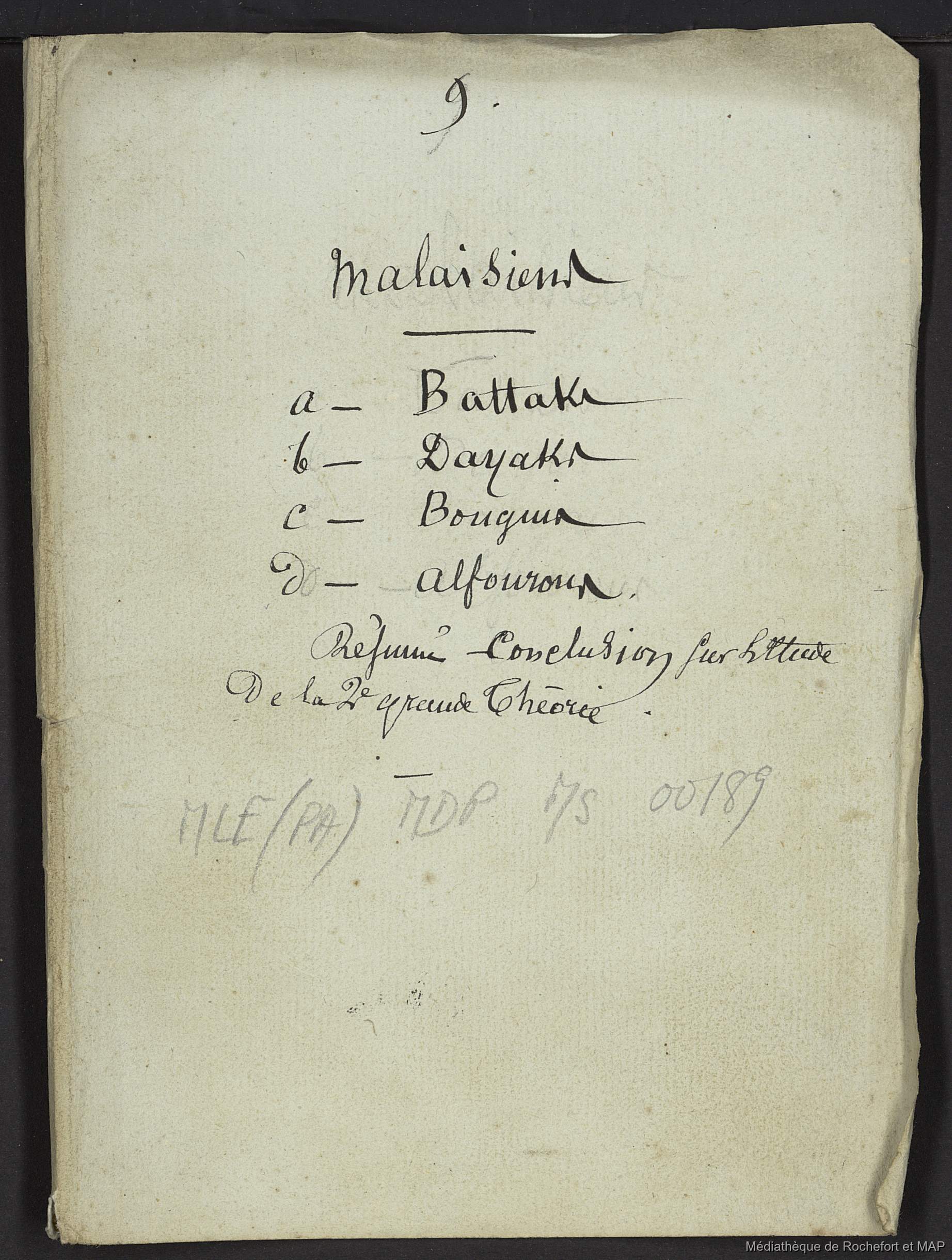 Théorie des migrations. Malaisiens, Battaks, Dayaks, banguis, alfourous; Conclusion de la 2ème grande théorie. (B172996201_Ms00189) [Set(s) 1443]