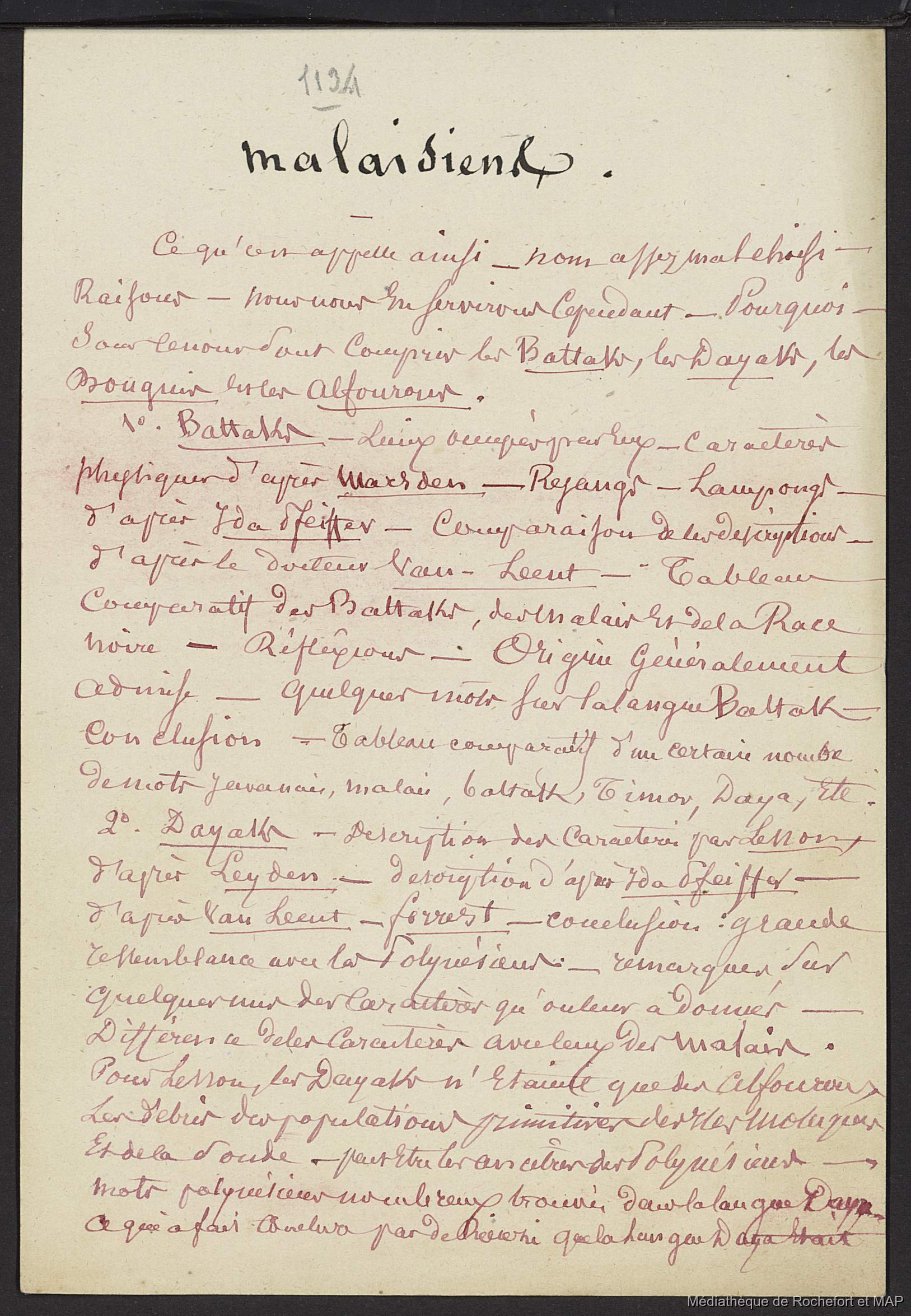 Lesson, Pierre-Adolphe [accessed: 2026/2/11]. "Théorie des migrations. Malaisiens, Battaks, Dayaks, banguis, alfourous; Conclusion de la 2ème grande théorie. (B172996201_Ms00189)" (Object Id: 165962). In