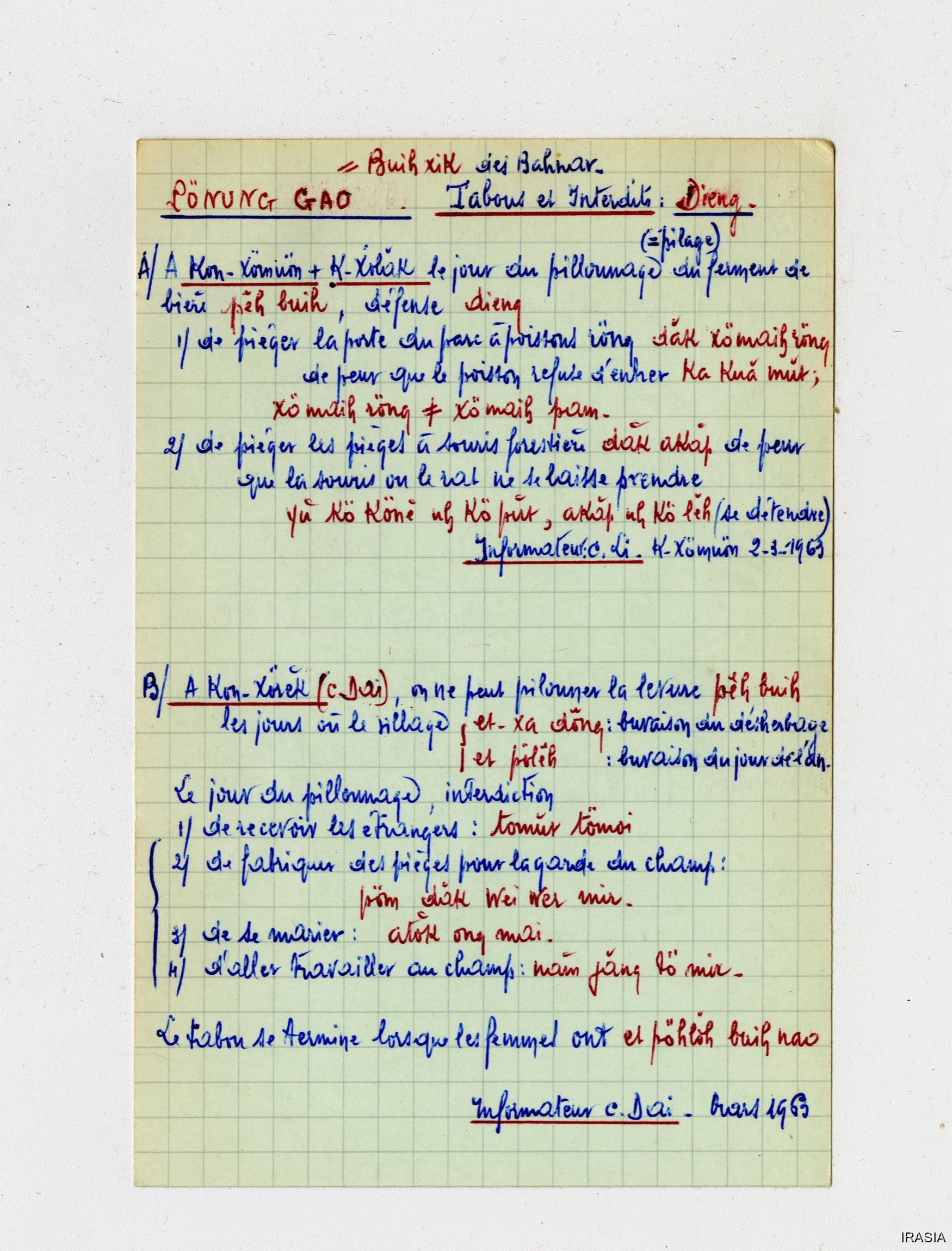 Quote this document Léger, Daniel [accessed: 2026/1/25]. "Lexique : Fiches Bahnar" (Object Id: 170230). In Lexique : Fiches Bahnar. ODSAS: https://www.odsas.net/object/170230.