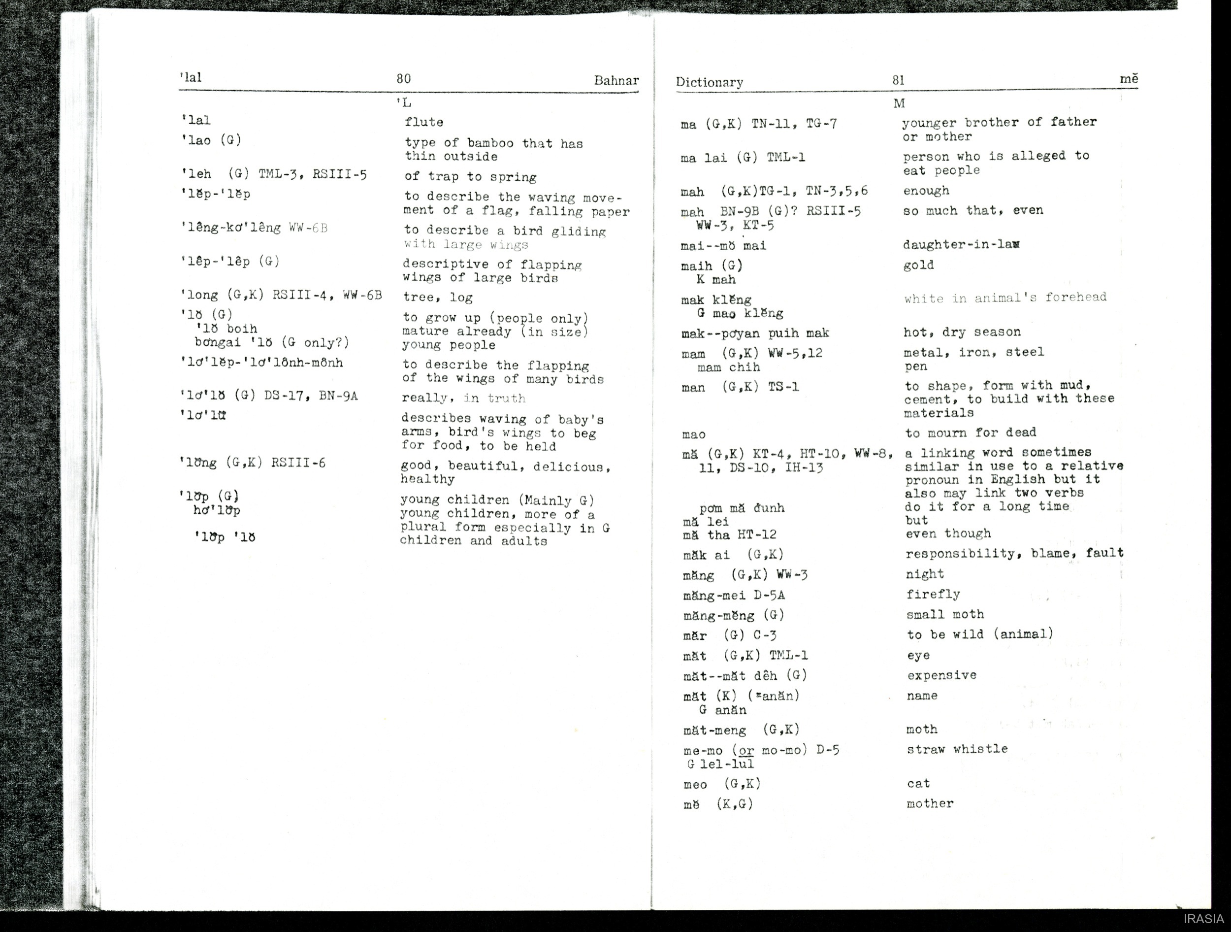 Quote this document Léger, Daniel 1979 [accessed: 2026/1/13]. "Lexique : bahnar dictionary" (Object Id: 171238). In Lexique : bahnar dictionary. ODSAS: https://www.odsas.net/object/171238.