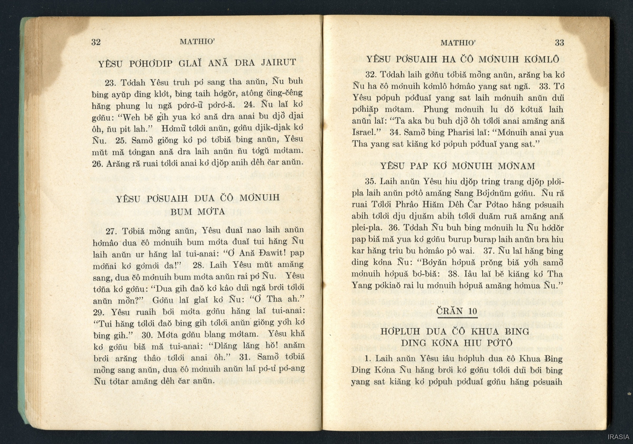 Quote this document Dournes, Jacques 1946-1955 [accessed: 2026/2/2]. "Evangiles : Tơlơi phrâo hiăm MATHIƠ" (Object Id: 174628). In Evangiles : Tơlơi phrâo hiăm MATHIƠ. ODSAS: https://www.odsas.net/object/174628.