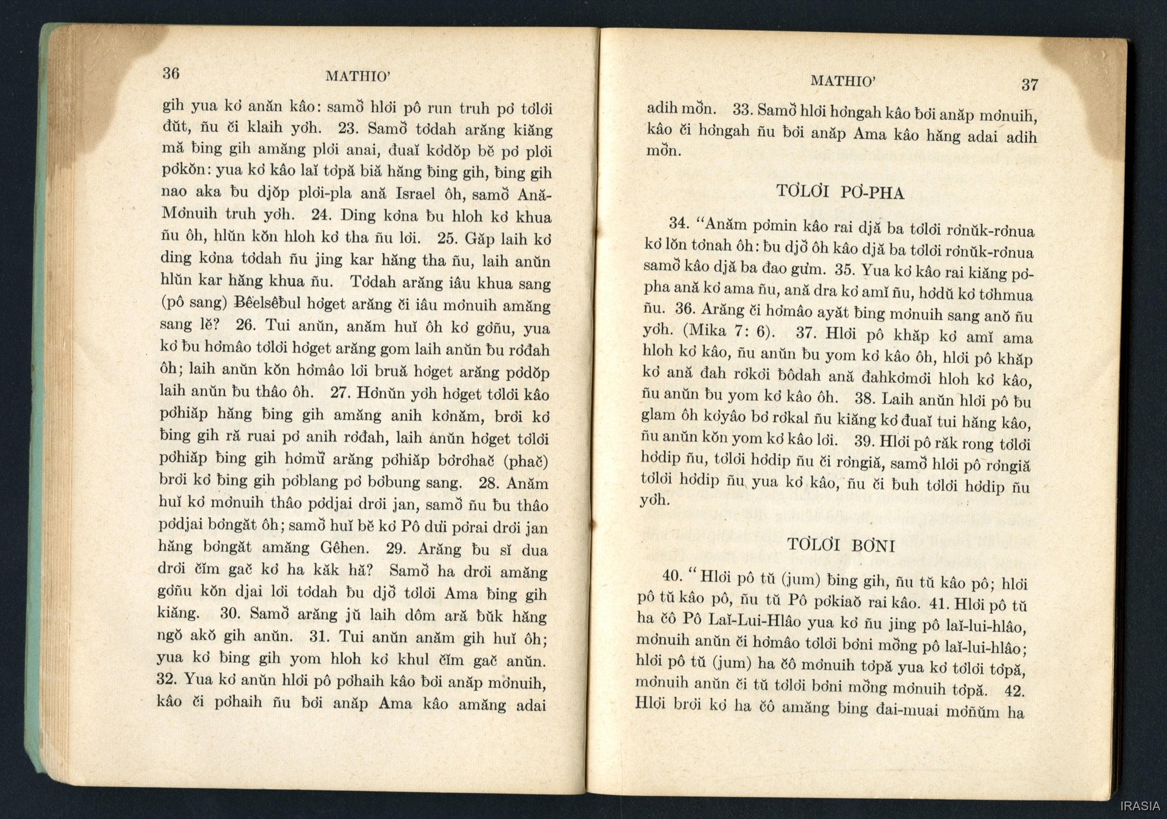 Quote this document Dournes, Jacques 1946-1955 [accessed: 2026/2/2]. "Evangiles : Tơlơi phrâo hiăm MATHIƠ" (Object Id: 174630). In Evangiles : Tơlơi phrâo hiăm MATHIƠ. ODSAS: https://www.odsas.net/object/174630.