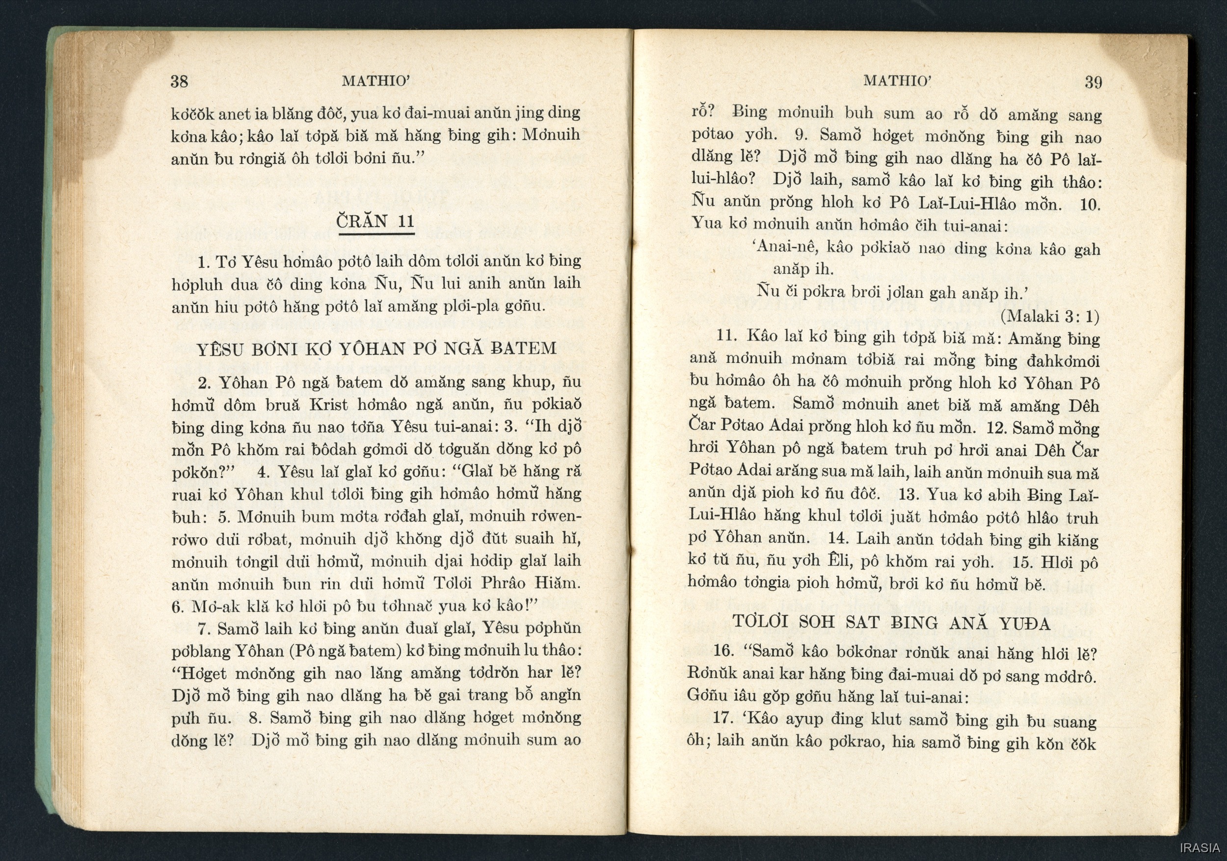 Quote this document Dournes, Jacques 1946-1955 [accessed: 2026/2/2]. "Evangiles : Tơlơi phrâo hiăm MATHIƠ" (Object Id: 174631). In Evangiles : Tơlơi phrâo hiăm MATHIƠ. ODSAS: https://www.odsas.net/object/174631.