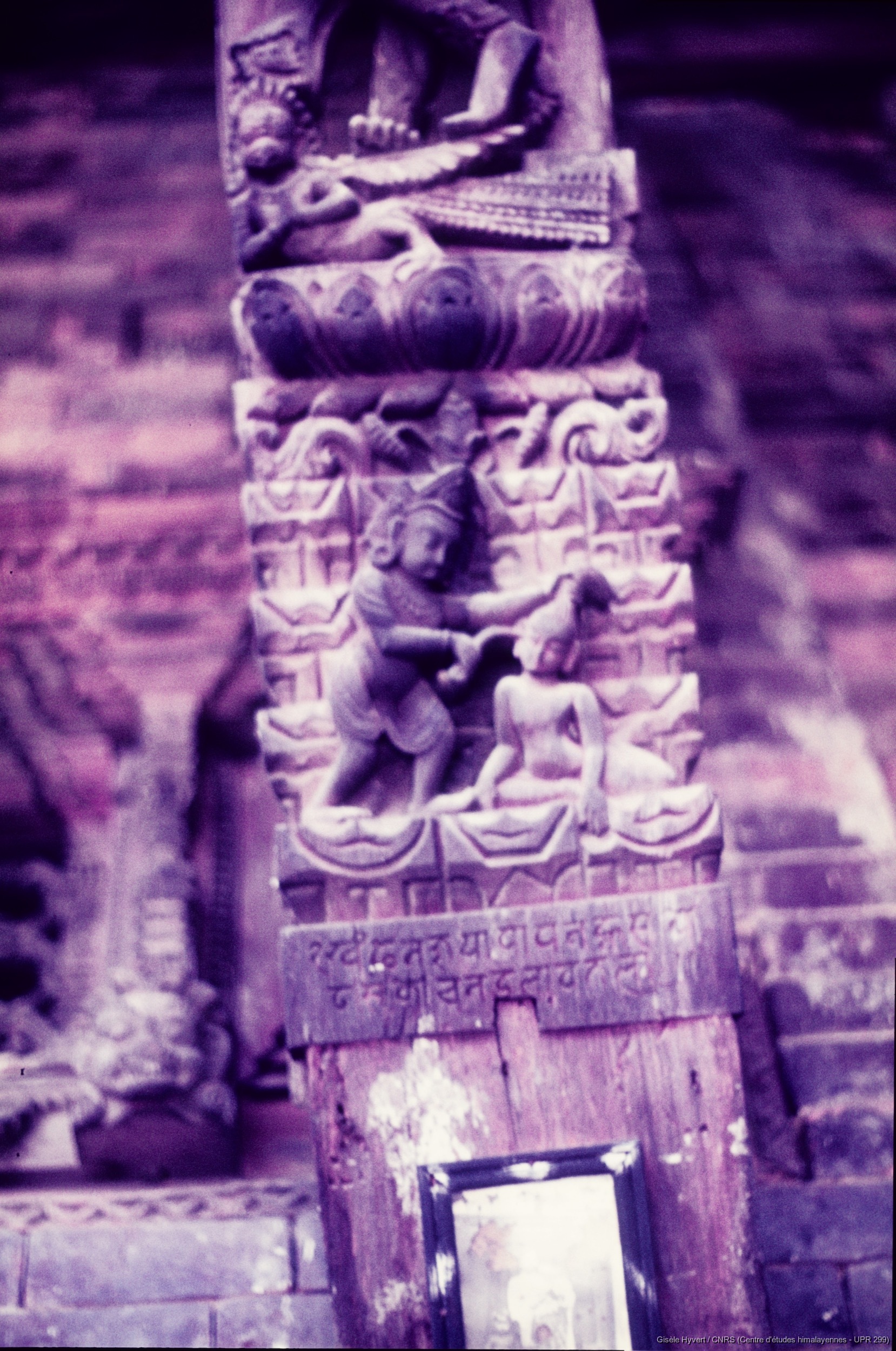 Vallée de Kathmandu c.1970 / Partie basse d'un aisselier en bois sculpté (Tadhu Che baha ?).  / Hyvert, Gisèle  / Bhaktapur (Bhaktapur district), Népal