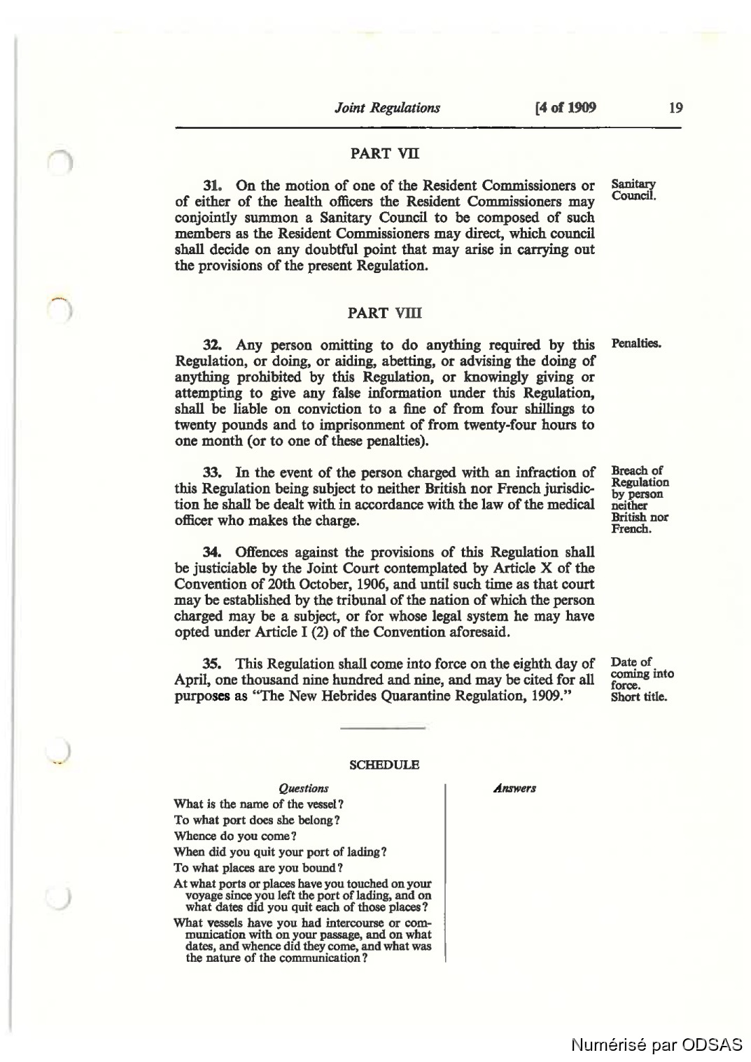 pnrposes ns “The New Hebrides Quaranfine Regulntîon, 1909.”