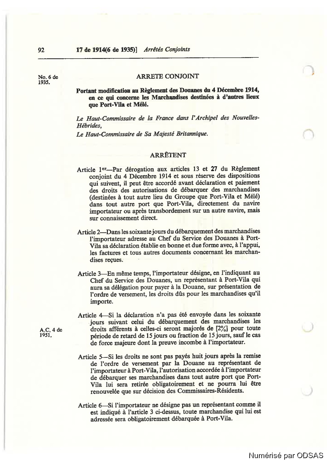 Parlant modification au Règlet des Douanes du 4 Décembre 1914,