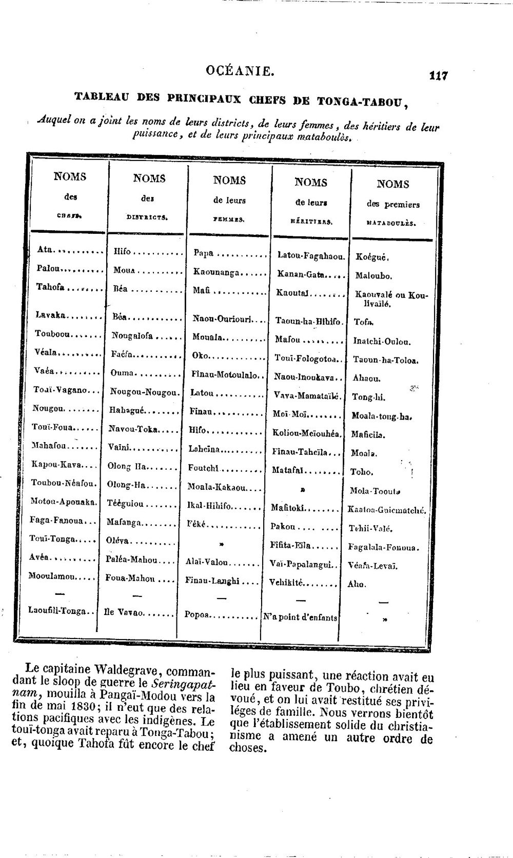 Oceanie ou Cinquième Partie du Monde, tome 3, par Domeny de Rienzi, M.G.L. / Tableau des Principaux Chefs de Tonga-Tabou / Domeny de Rienzi, Grégoire-Louis / Tonga