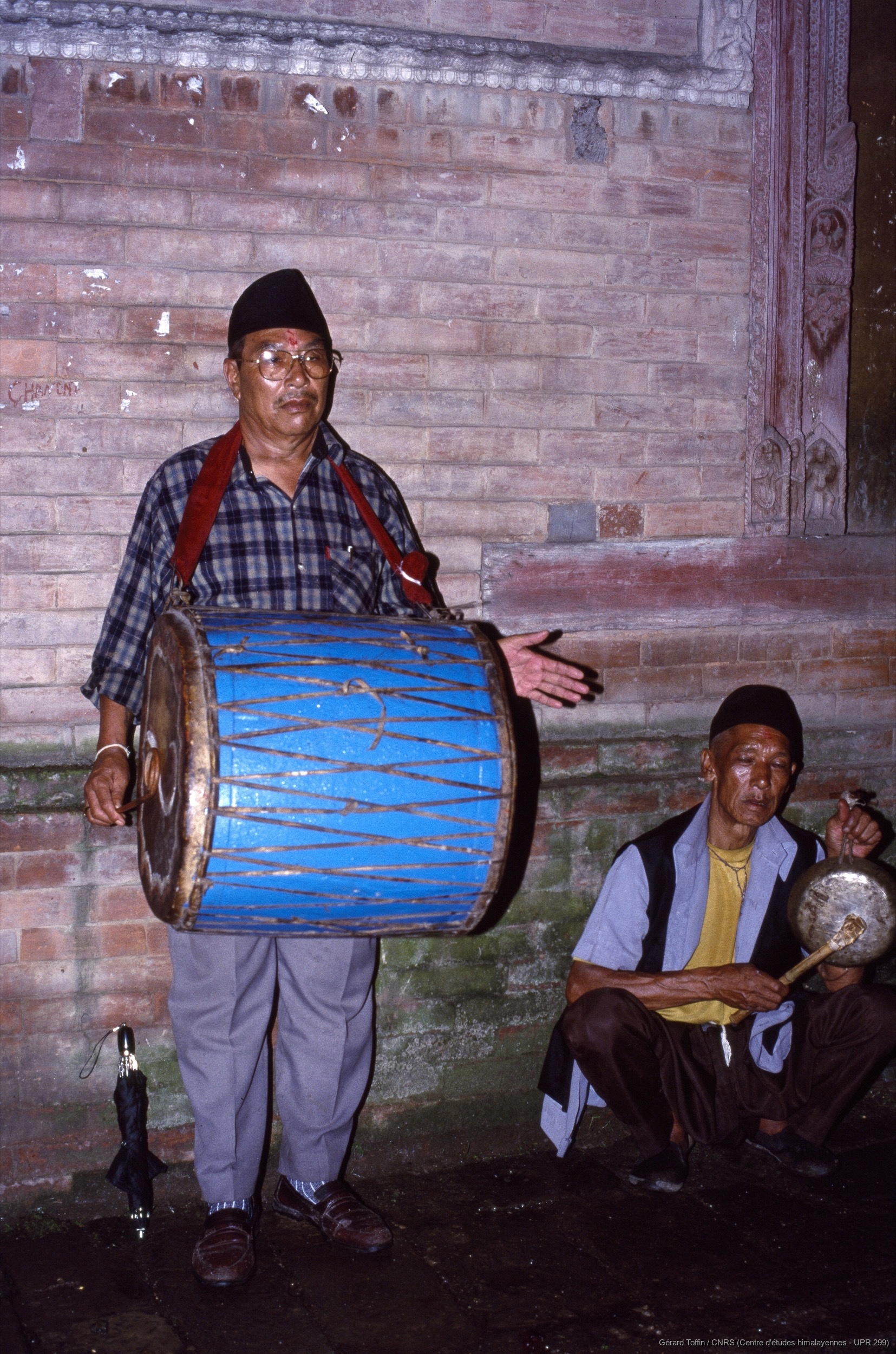 Album Indra Jatra (1974-2005) / Indra Jatra : musicien Jyapu devant le temple de Svet Bhairav