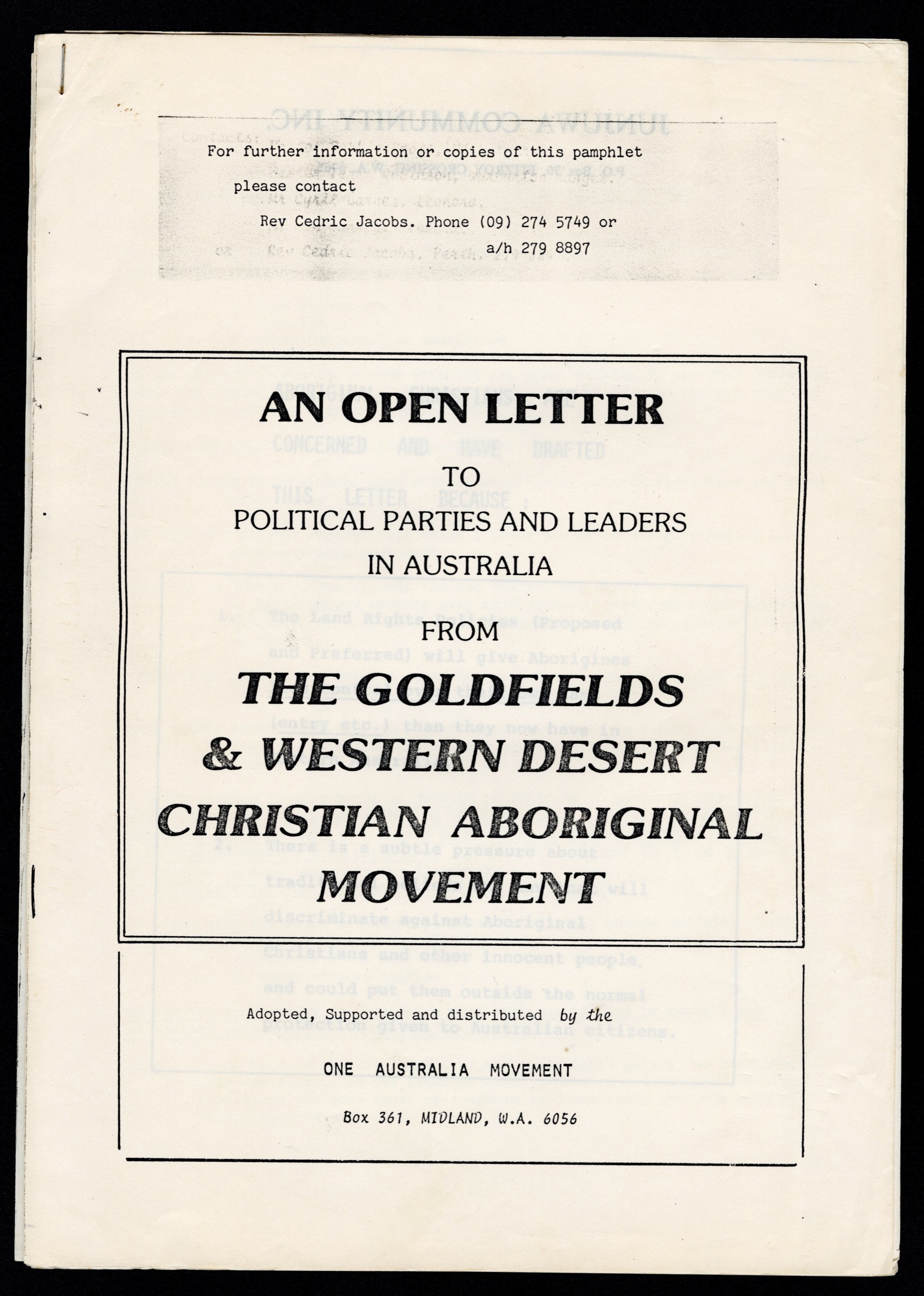 [accessed: 2026/2/14]. "An open letter to political parties and leaders in Australia from The Goldfields & Western Desert Christian Aborignal Movement" (Object Id: 313564). In