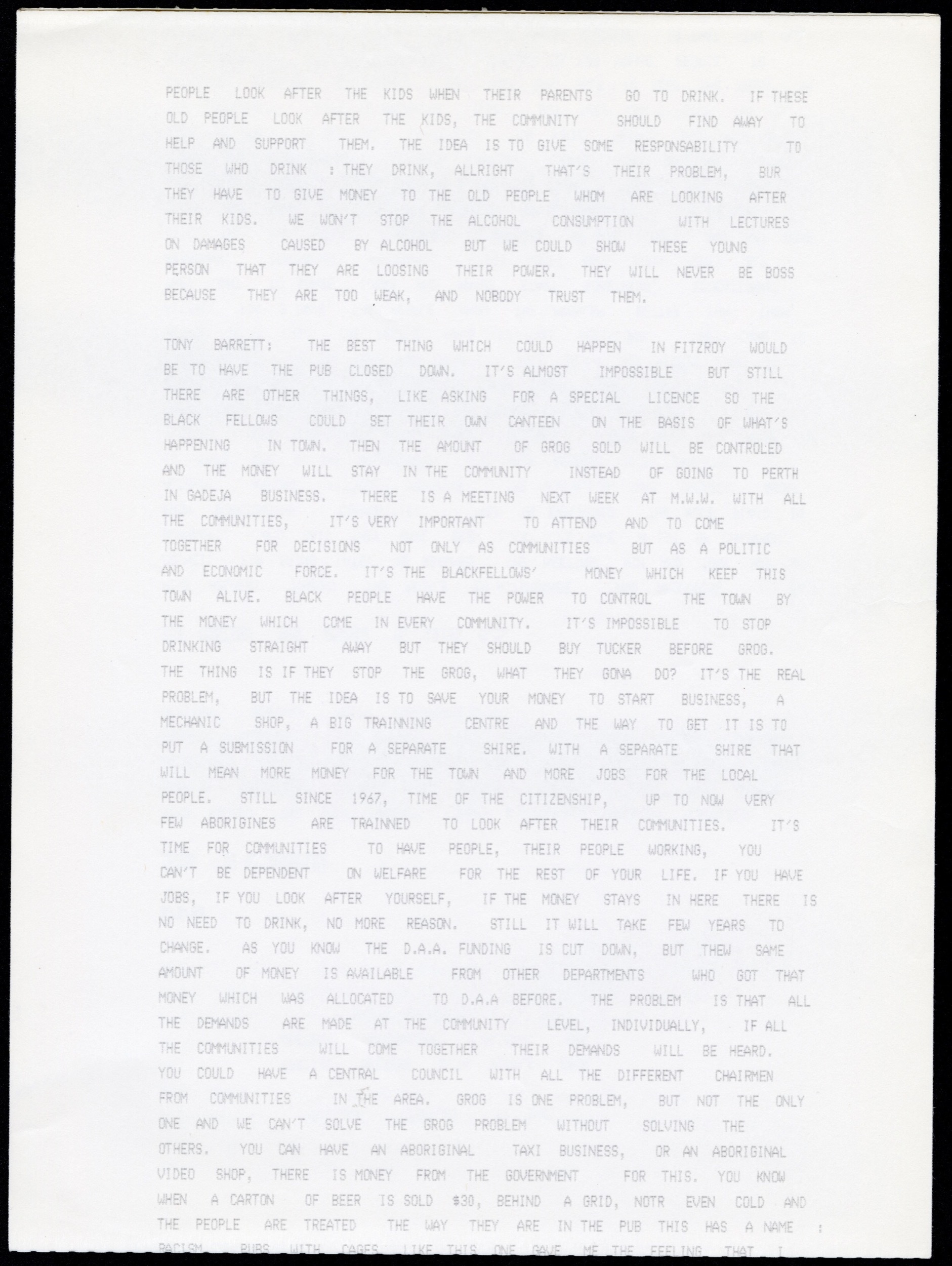 Quote this document 1986-03-06 [accessed: 2026/1/17]. "Junjuwa Community Inc. Special meeting with people from Western Autralian Alcoohol and Drug Authority" (Object Id: 314435). In Junjuwa Community Inc. Special meeting with people from Western Autralian Alcoohol and Drug Authority. ODSAS: https://www.odsas.net/object/314435.