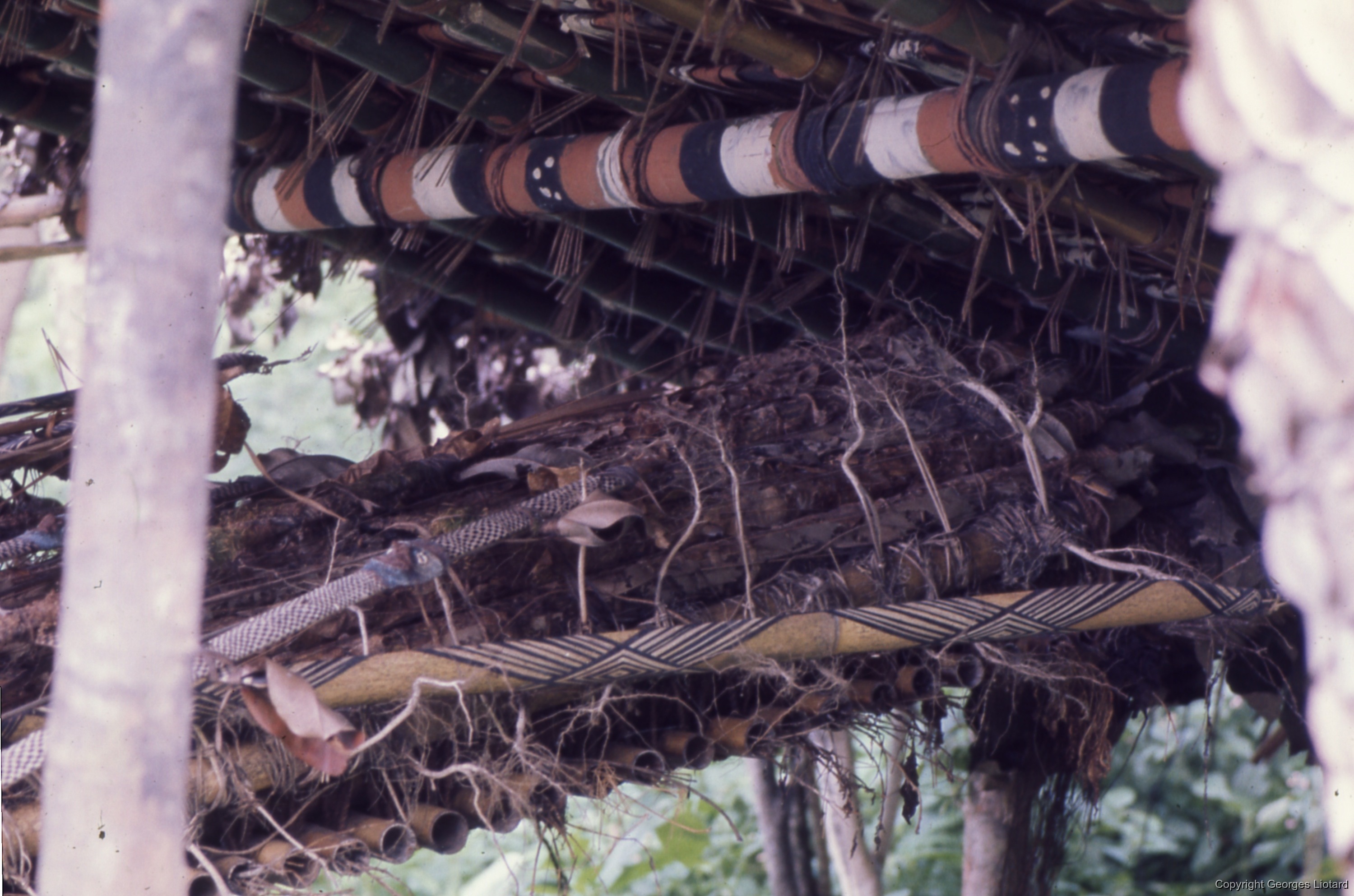 Détails de la plate-forme funéraire sur laquelle repose le vieux chef "Mweleun" décédé environ un mois avant mon passage (Mars/Avril 1976). On remarque : un crâne surmodelé, un arc cérémoniel (en fait 5 arcs reliés entre eux par des traverses - à noter le travail de vannerie et les petites masquettes surmodelées). Les pieds du vieux chef sont encore visibles sur le bas de la plate-forme à l'avant du crâne).