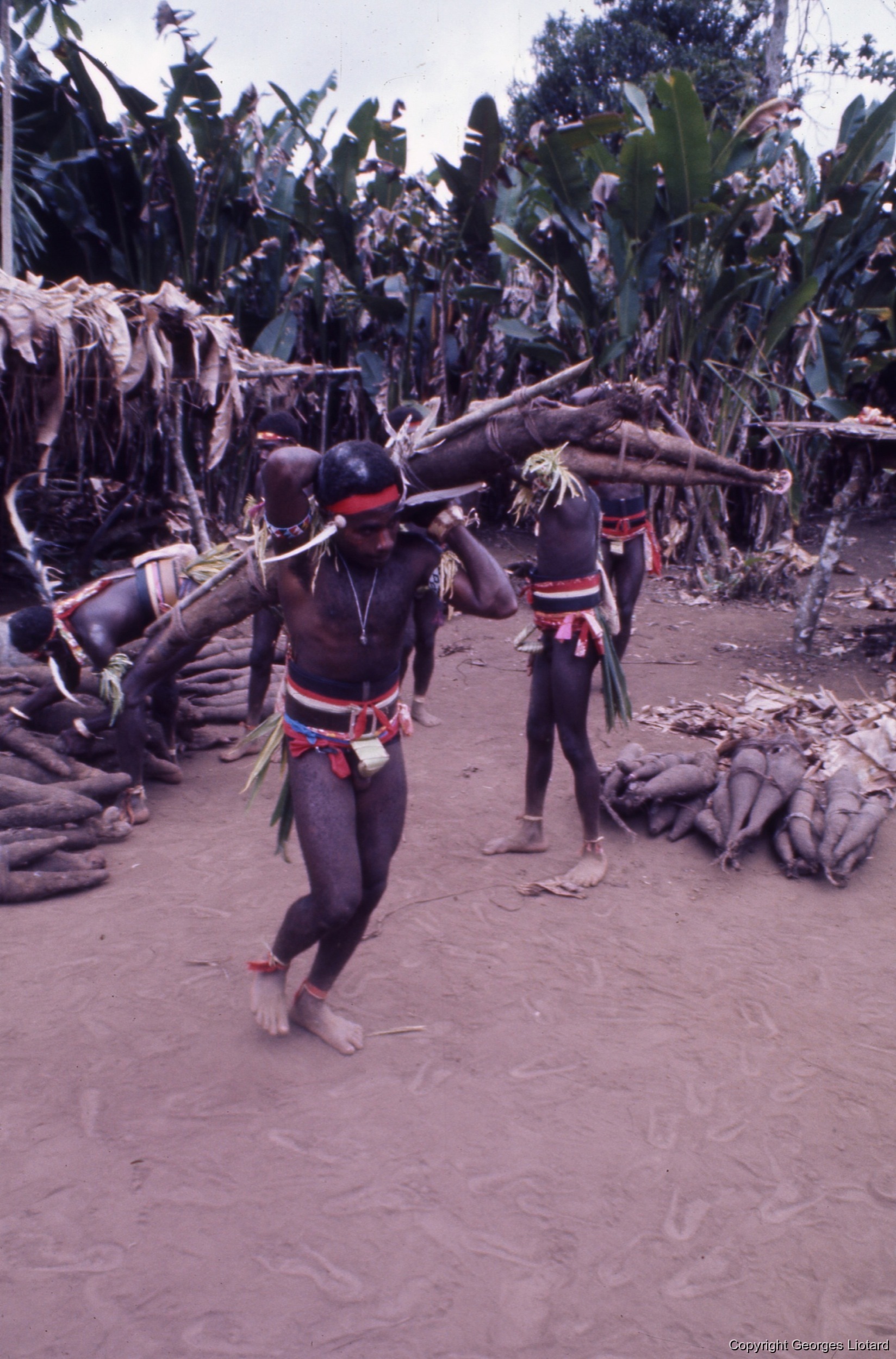 Liotard, Georges 1974 [accessed: 2026/2/3]. "Ignames transportés: En file et en dansant, les ignames sont transportés à dos d'hommes sous la conduite du vieux chef." (Object Id: 46644). In