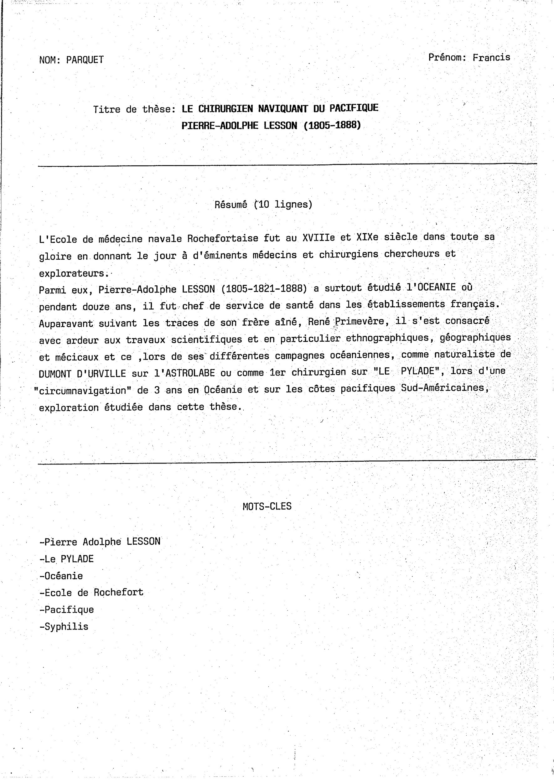 Francis Parquet: Le Chirurgien naviguant du Pacifique, Pierre-Adolphe Lesson (1805-1888)
