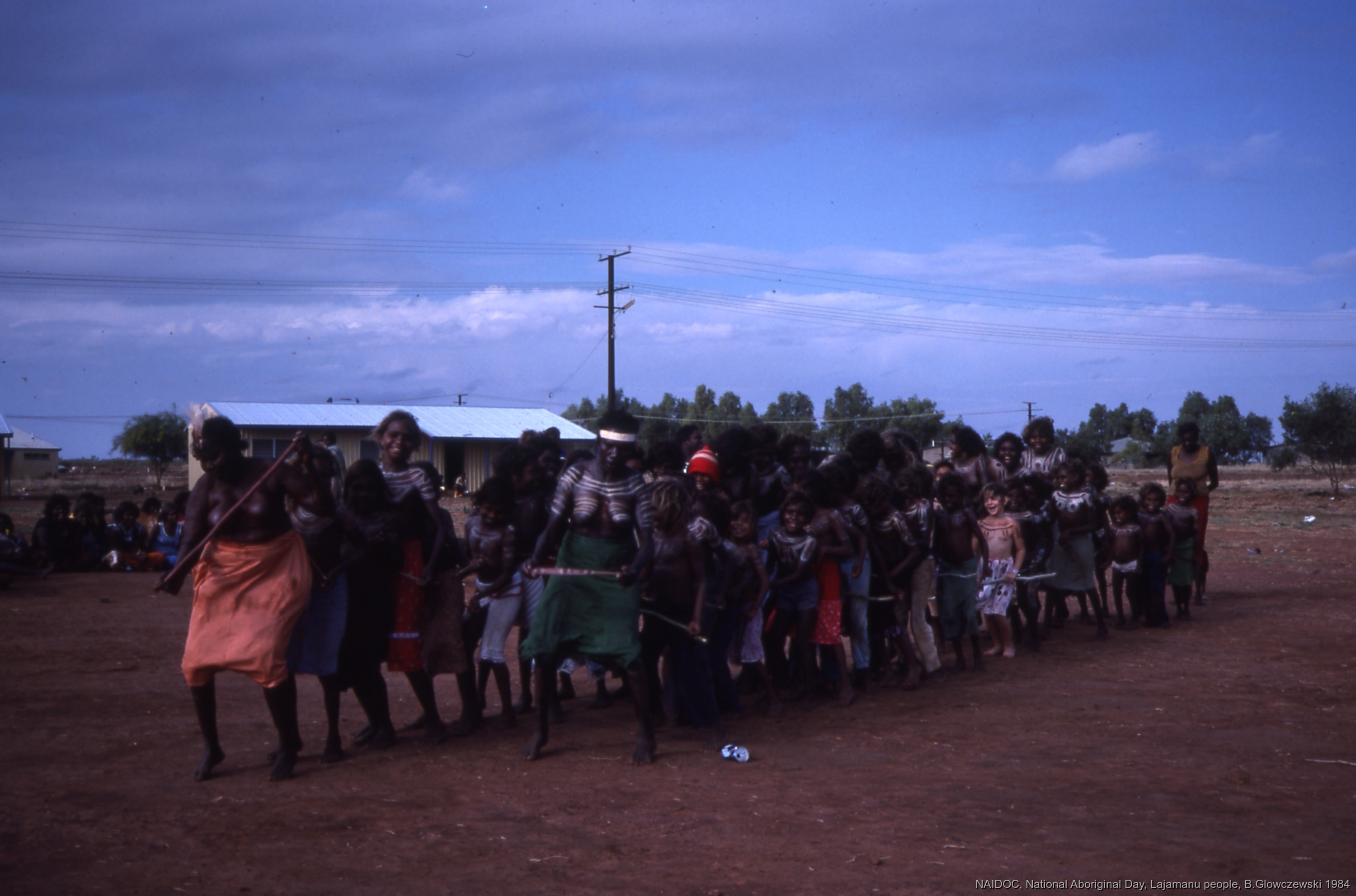Quote this document Glowczewski, Barbara 1984/09/12 [accessed: 2026/1/26]. "Girls dance in ranks with women in front; they hold kuturu (sticks); Children and adults celebrate the end of School" (Object Id: 84687). In NAIDOC: National Aboriginal Day, Lajamanu and Katherine, 1984 (photos). ODSAS: https://www.odsas.net/object/84687.