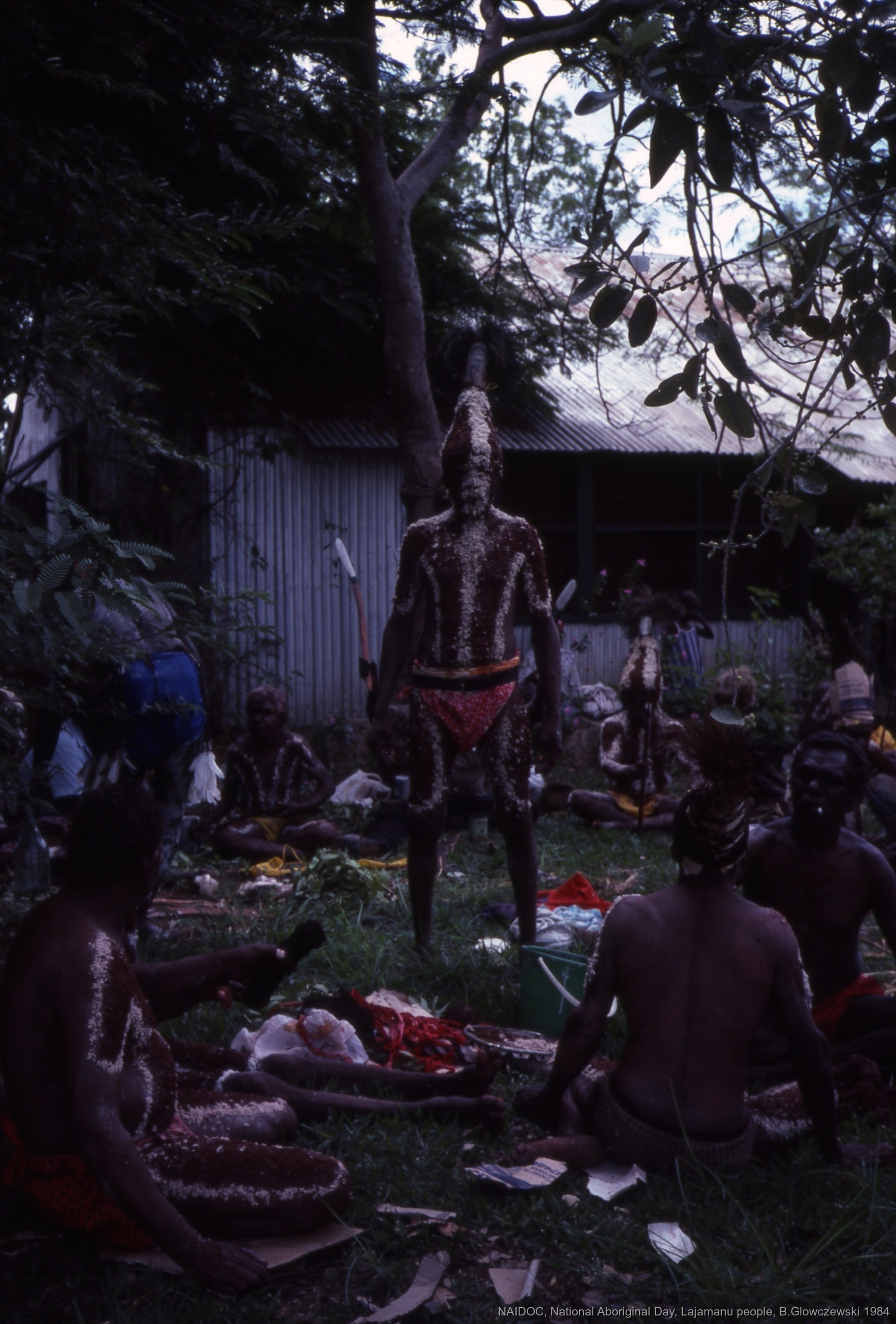 Glowczewski, Barbara 1984/09/14 [accessed: 2026/2/8]. "Lajamanu men get prepared for Jurntu purlapa. One man full painted with headress. Public performance for NAIDOC" (Object Id: 84727). In