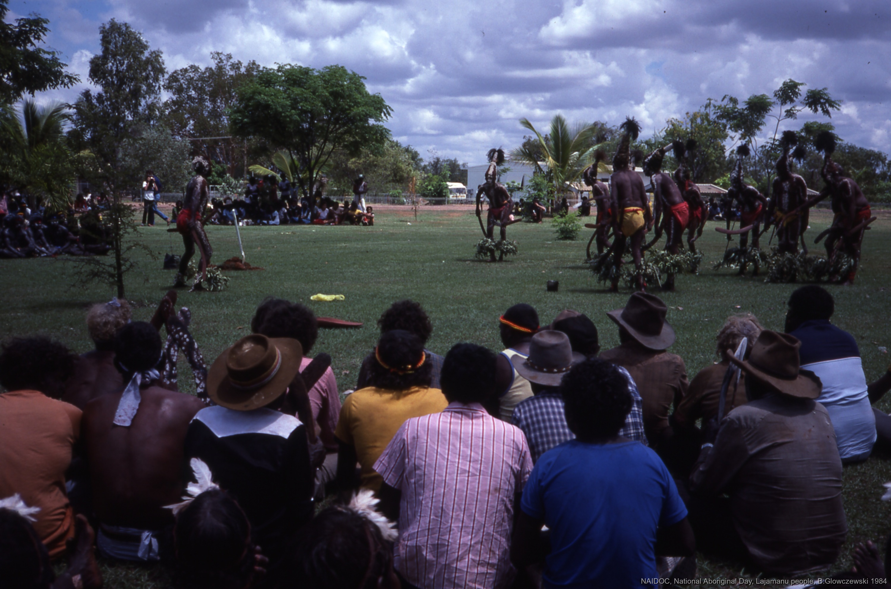 Quote this document Glowczewski, Barbara 1984/09/14 [accessed: 2026/1/25]. "Lajamanu men dance Jurntu purlapa. Public performance for NAIDOC" (Object Id: 84772). In NAIDOC: National Aboriginal Day, Lajamanu and Katherine, 1984 (photos). ODSAS: https://www.odsas.net/object/84772.