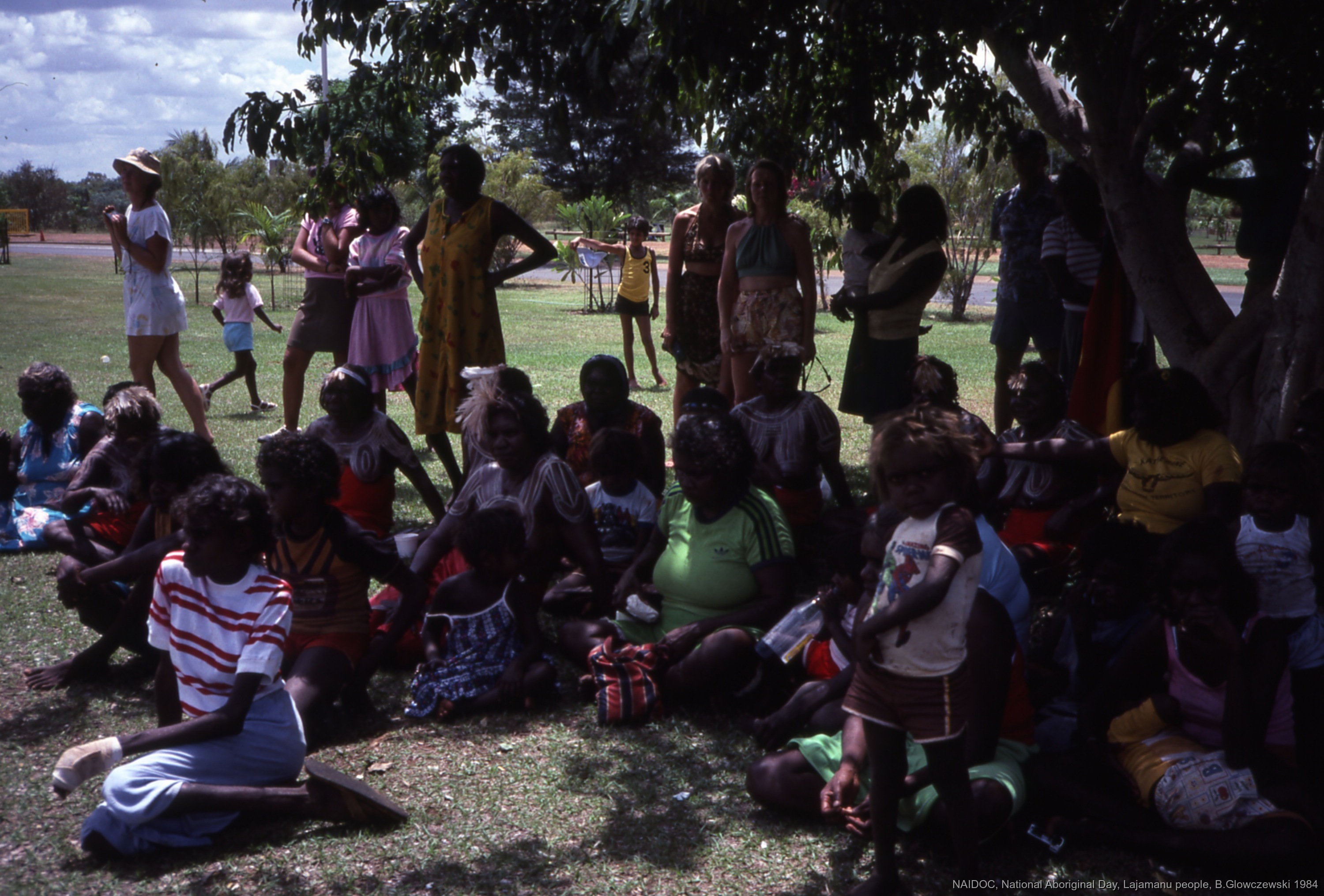 Glowczewski, Barbara 1984/09/14 [accessed: 2026/1/25]. "Lajamanu women and girls watch Lajamanu men dancing Jurntu purlapa. Public performance for NAIDOC" (Object Id: 84780). In