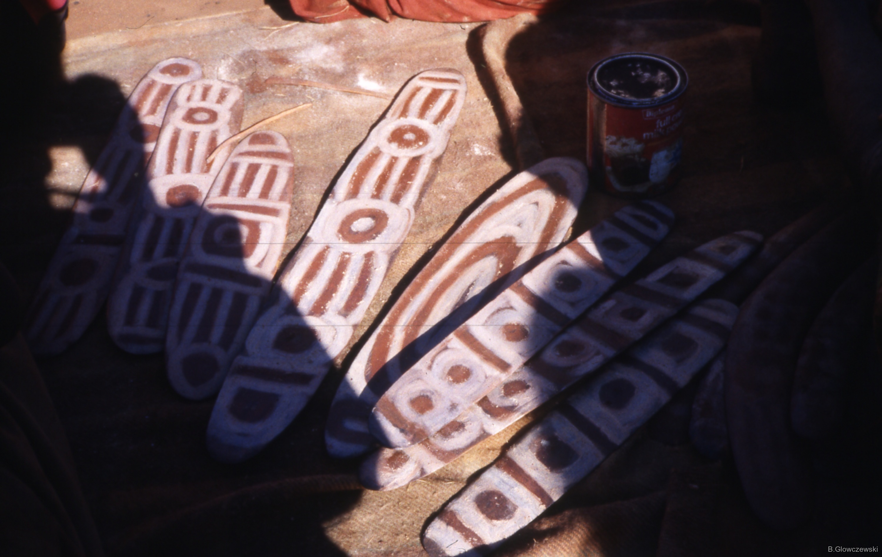 Quote this document Glowczewski, Barbara 1984/08/05 [accessed: 2026/1/13]. "Yukurrukurru women slates painted with NGARLU () and WITI (Leafy poles) designs" (Object Id: 85159). In Yawulyu 2 - dancing in Kurlungalinpa and on the way back to Lajamanu. ODSAS: https://www.odsas.net/object/85159.