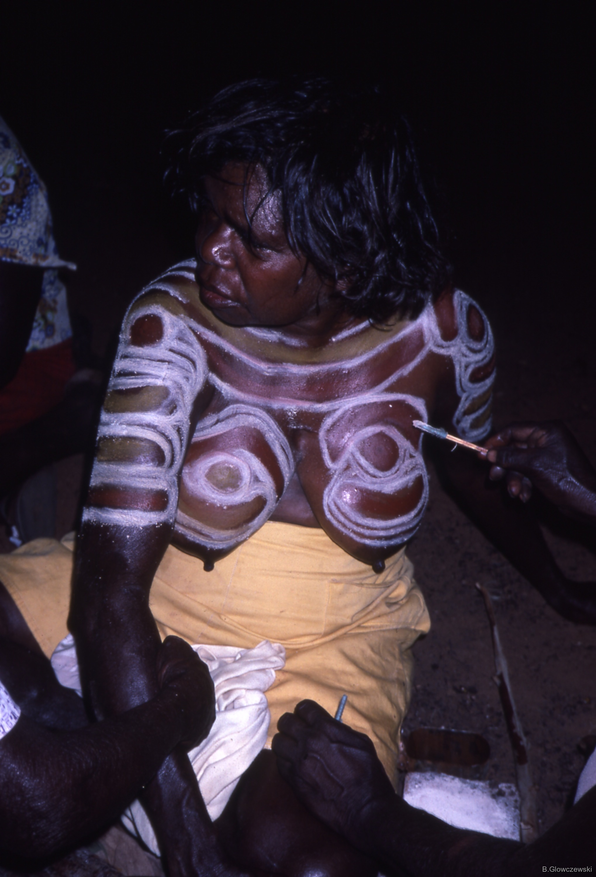 Quote this document Glowczewski, Barbara 1984/10/08 [accessed: 2026/1/13]. "Lily Nungarrayi is being painted NGAPA, kulpalumu" (Object Id: 85318). In Yawulyu 2 - dancing in Kurlungalinpa and on the way back to Lajamanu. ODSAS: https://www.odsas.net/object/85318.