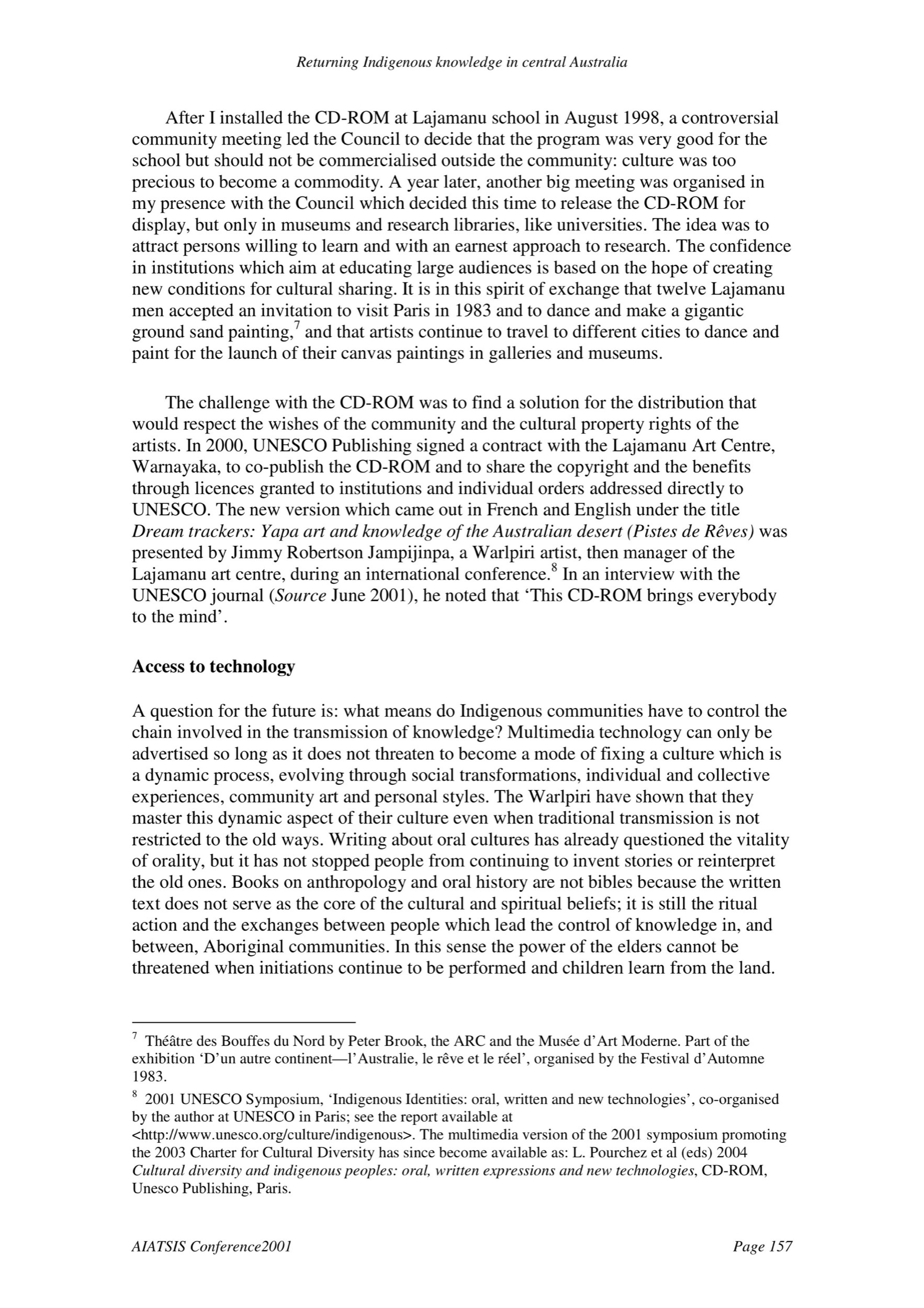 After I installed the CD-ROM at Lajamanu school in August 1998, a controversial community meeting led the Council to decide that the program was very good for the school but should not be commercialised outside the community: culture was too precious to become a commodity. A year later, another big meeting was organised in my presence with the Council which decided this time to release the CD-ROM for display, but only in museums and research libraries, like universities. The idea was to attract persons willing to learn and with an earnest approach to research. The confidence in institutions which aim at educating large audiences is based on the hope of creating new conditions for cultural sharing. It is in this spirit of exchange that twelve Lajamanu men accepted an invitation to visit Paris in 1983 and to dance and make a gigantic ground sand painting,7 and that artists continue to travel to different cities to dance and paint for the launch of their canvas paintings in galleries and museums. The challenge with the CD-ROM was to find a solution for the distribution that would respect the wishes of the community and the cultural property rights of the artists. In 2000, UNESCO Publishing signed a contract with the Lajamanu Art Centre, Warnayaka, to co-publish the CD-ROM and to share the copyright and the benefits through licences granted to institutions and individual orders addressed directly to UNESCO. The new version which came out in French and English under the title Dream trackers: Yapa art and knowledge of the Australian desert (Pistes de Rêves) was presented by Jimmy Robertson Jampijinpa, a Warlpiri artist, then manager of the Lajamanu art centre, during an international conference.8 In an interview with the UNESCO journal (Source June 2001), he noted that ‘This CD-ROM brings everybody to the mind’. Access to technology A question for the future is: what means do Indigenous communities have to control the chain involved in the transmission of knowledge? Multimedia technology can only be advertised so long as it does not threaten to become a mode of fixing a culture which is a dynamic process, evolving through social transformations, individual and collective experiences, community art and personal styles. The Warlpiri have shown that they master this dynamic aspect of their culture even when traditional transmission is not restricted to the old ways. Writing about oral cultures has already questioned the vitality of orality, but it has not stopped people from continuing to invent stories or reinterpret the old ones. Books on anthropology and oral history are not bibles because the written text does not serve as the core of the cultural and spiritual beliefs; it is still the ritual action and the exchanges between people which lead the control of knowledge in, and between, Aboriginal communities. In this sense the power of the elders cannot be threatened when initiations continue to be performed and children learn from the land. 7 Théâtre des Bouffes du Nord by Peter Brook, the ARC and the Musée d’Art Moderne. Part of the exhibition ‘D’un autre continent—l’Australie, le rêve et le réel’, organised by the Festival d’Automne 1983. 8 2001 UNESCO Symposium, ‘Indigenous Identities: oral, written and new technologies’, co-organised by the author at UNESCO in Paris; see the report available at <HTTP://www.unesco.org/culture/indigenous>. The multimedia version of the 2001 symposium promoting the 2003 Charter for Cultural Diversity has since become available as: L. Pourchez et al (eds) 2004 Cultural diversity and indigenous peoples: oral, written expressions and new technologies, CD-ROM, Unesco Publishing, Paris.