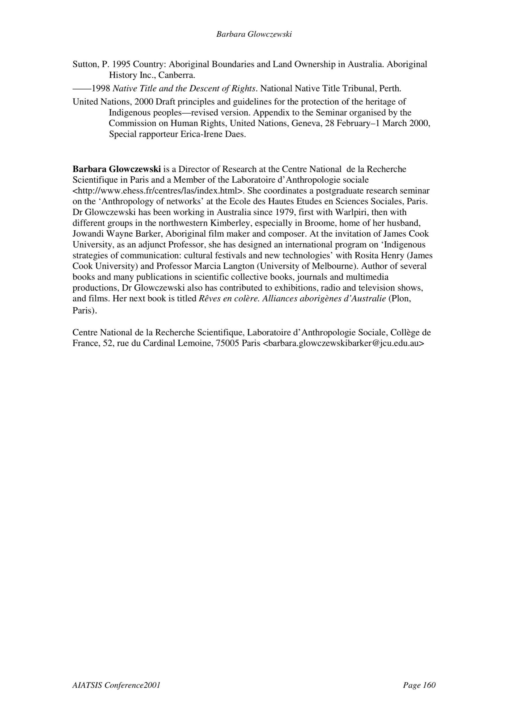 Sutton, P. 1995 Country: Aboriginal Boundaries and Land Ownership in Australia. Aboriginal History Inc., Canberra. ——1998 Native Title and the Descent of Rights. National Native Title Tribunal, Perth. United Nations, 2000 Draft principles and guidelines for the protection of the heritage of Indigenous peoples—revised version. Appendix to the Seminar organised by the Commission on Human Rights, United Nations, Geneva, 28 February–1 March 2000, Special rapporteur Erica-Irene Daes. Barbara Glowczewski is a Director of Research at the Centre National de la Recherche Scientifique in Paris and a Member of the Laboratoire d’Anthropologie sociale <http://www.ehess.fr/centres/las/index.html>. She coordinates a postgraduate research seminar on the ‘Anthropology of networks’ at the Ecole des Hautes Etudes en Sciences Sociales, Paris. Dr Glowczewski has been working in Australia since 1979, first with Warlpiri, then with different groups in the northwestern Kimberley, especially in Broome, home of her husband, Jowandi Wayne Barker, Aboriginal film maker and composer. At the invitation of James Cook University, as an adjunct Professor, she has designed an international program on ‘Indigenous strategies of communication: cultural festivals and new technologies’ with Rosita Henry (James Cook University) and Professor Marcia Langton (University of Melbourne). Author of several books and many publications in scientific collective books, journals and multimedia productions, Dr Glowczewski also has contributed to exhibitions, radio and television shows, and films. Her next book is titled Rêves en colère. Alliances aborigènes d’Australie (Plon, Paris). Centre National de la Recherche Scientifique, Laboratoire d’Anthropologie Sociale, Collège de France, 52, rue du Cardinal Lemoine, 75005 Paris <barbara.glowczewskibarker@jcu.edu.au>