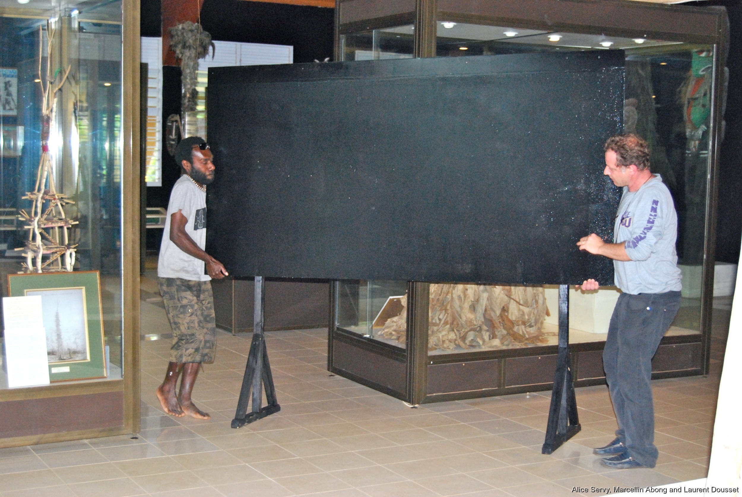 Exposition Photographique Funérailles à Malekula, Georges Liotard (préparation et déroulement de l'exposition) / Installation des panneaux / Alice Servy, Marcellin Abong, Laurent Dousset / VKS, Port Vila, Efate, Vanuatu